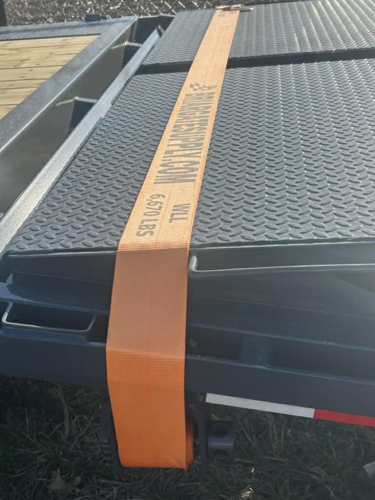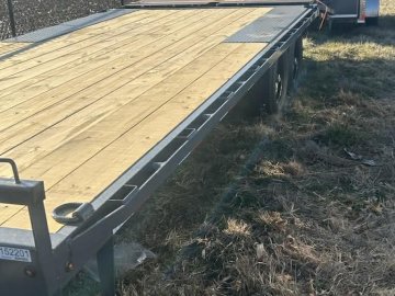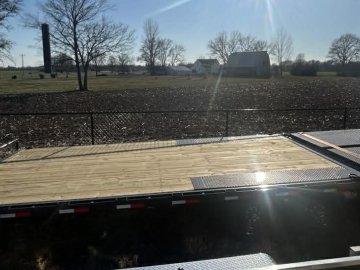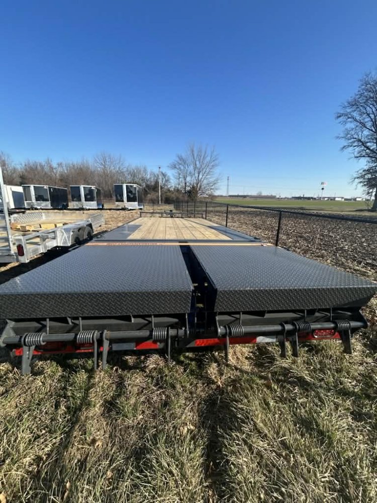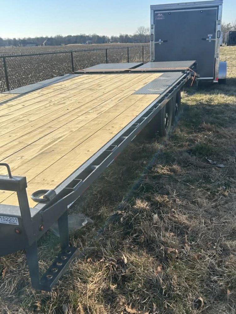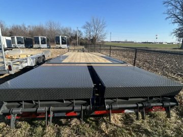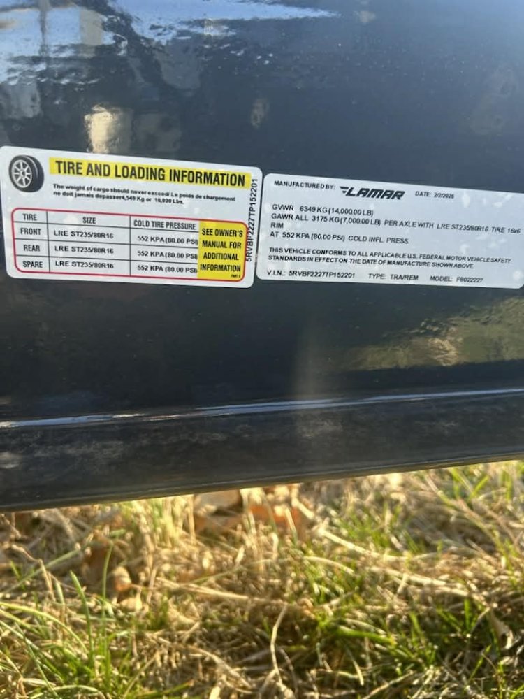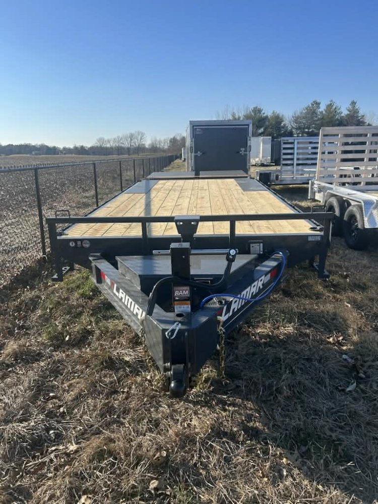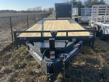 The Lamar F8022227 is a heavy-duty, bumper-pull 14K Deckover Equipment Trailer built for hauling large equipment loads. This model typically features a 102-inch by 22-foot deck length, offering a Gross Vehicle Weight Rating (GVWR) of 14,000 pounds, which translates to an approximate payload capacity of 10,030 pounds. It is constructed with an 8-inch 10 lb I-Beam frame, supported by tandem 7,000 lb EZ Lube electric brake axles, and features a treated yellow pine floor. Standard features often include a dovetail section with heavy-duty ramps (like spring-assisted Rhino Ramps), an adjustable coupler, a single 10K drop-leg jack, and Lamar's premium powder coat finish for durability.
