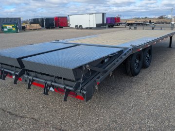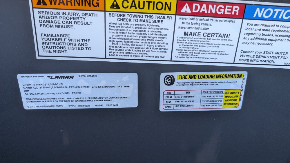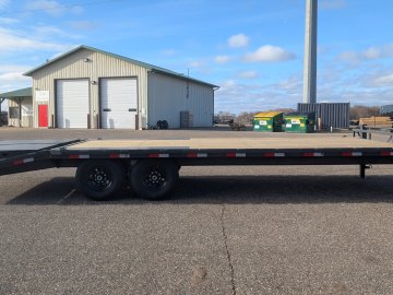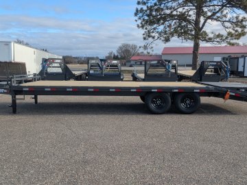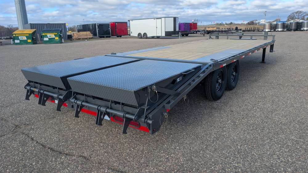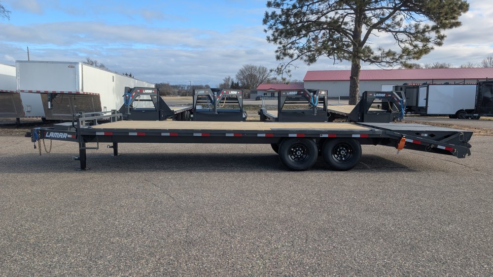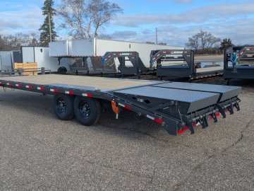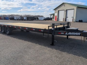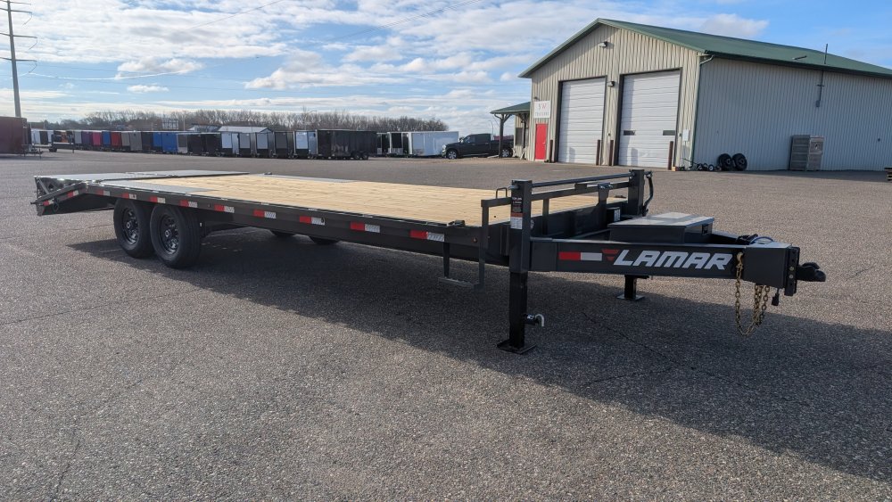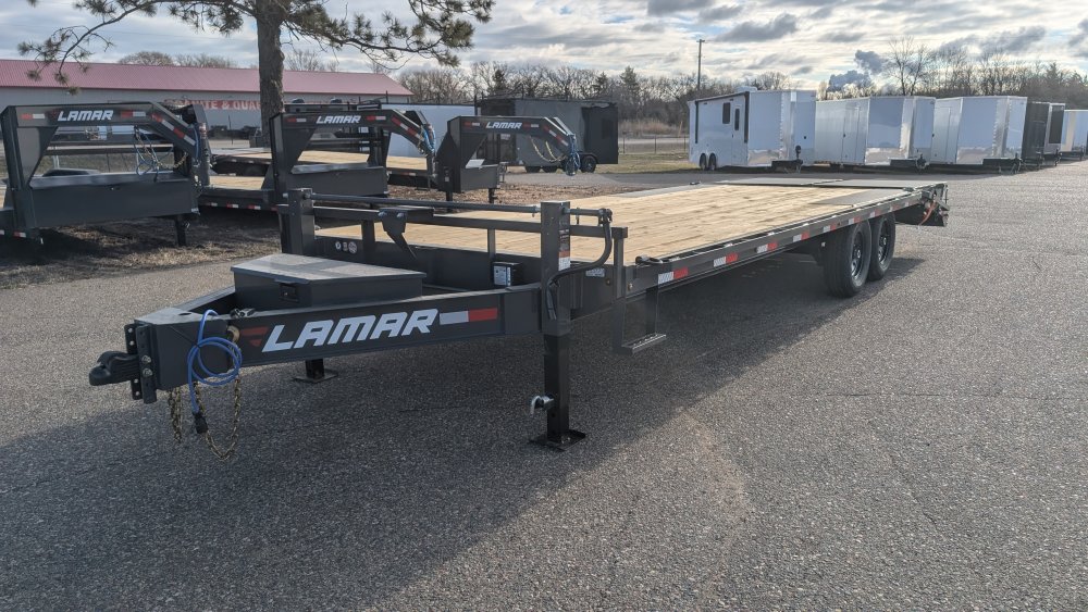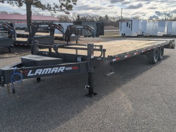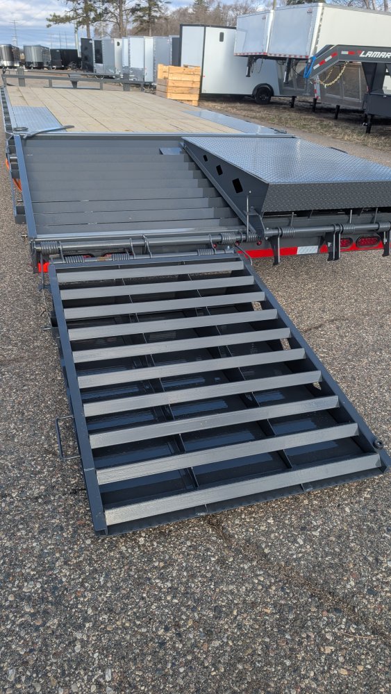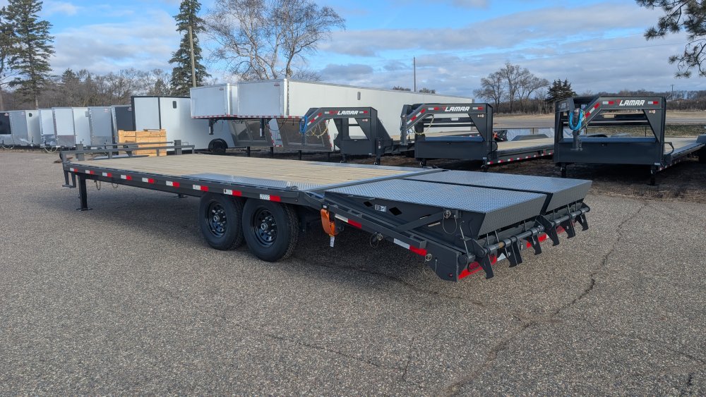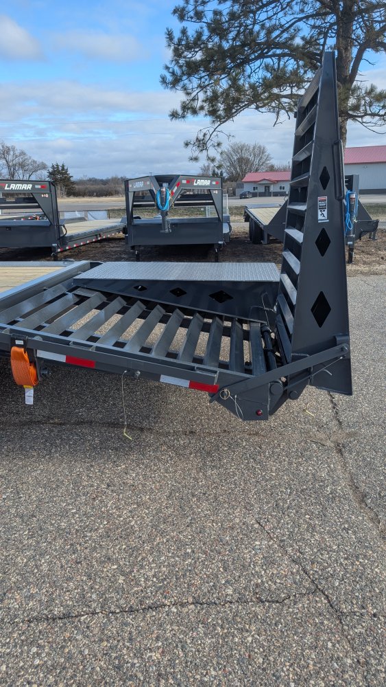 Get ready to haul with confidence on this 2026 Lamar F8 Deckover Bumper Pull trailer (Model F8022427). This versatile flatbed measures 102 inches wide by 24 feet long and is built on a solid 8-inch, 10 lb I-beam frame with 16-inch center-to-center crossmembers. It's rated for a 14,000 lbs GVWR, featuring two 7K EZ-Lube electric brake spring axles for reliable stopping power. This unit is designed for easy loading of equipment, featuring a 5-foot dovetail paired with heavy-duty Rhino Ramps.