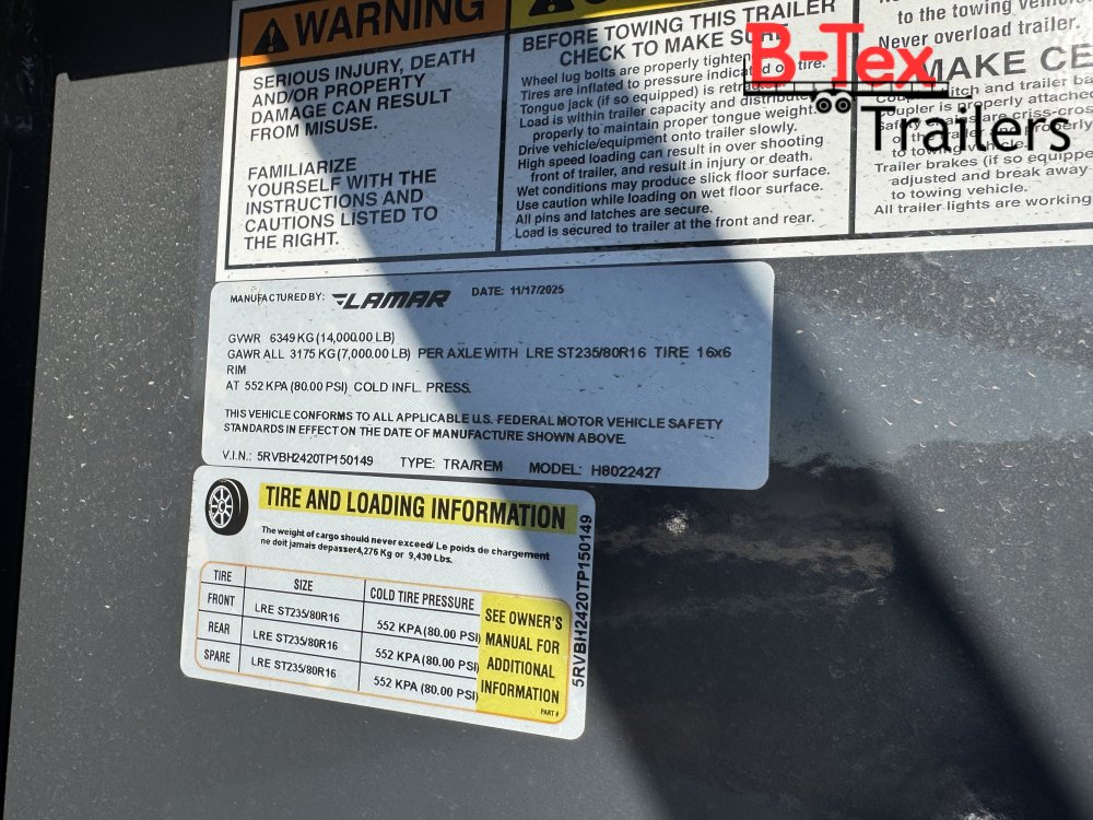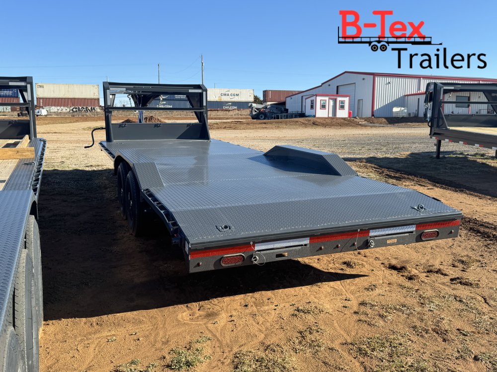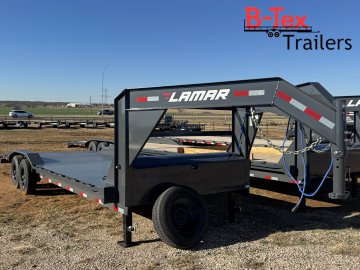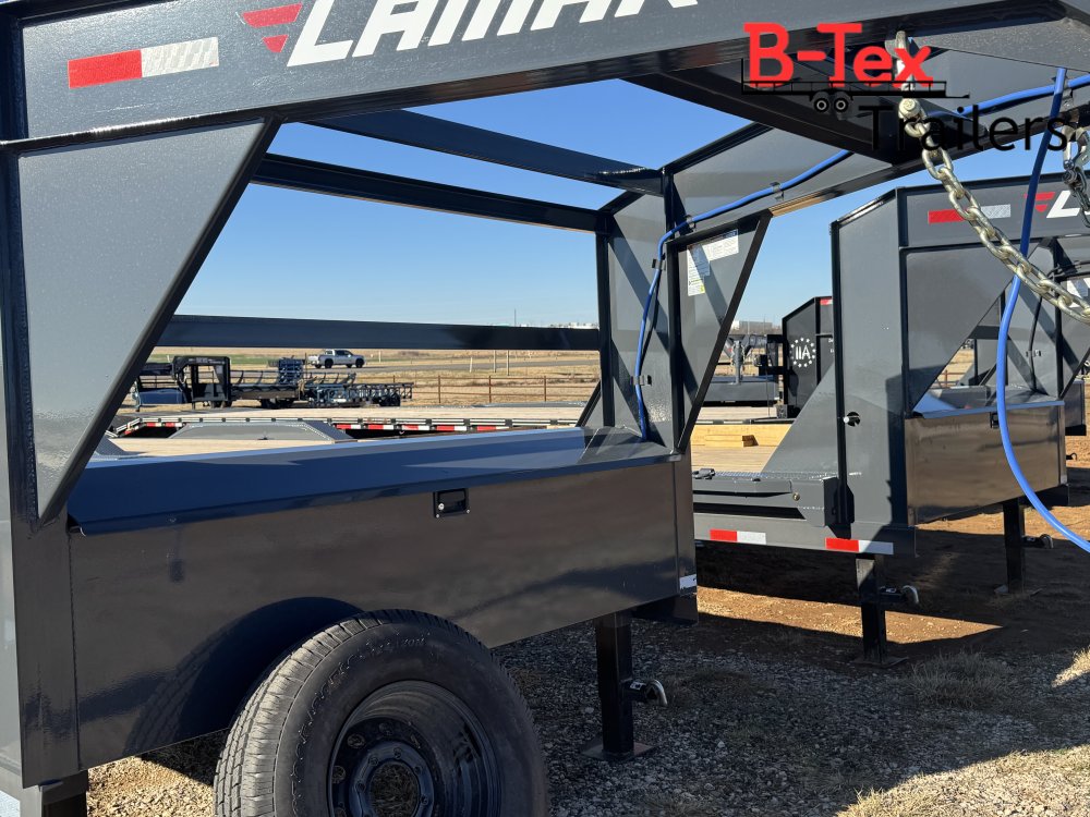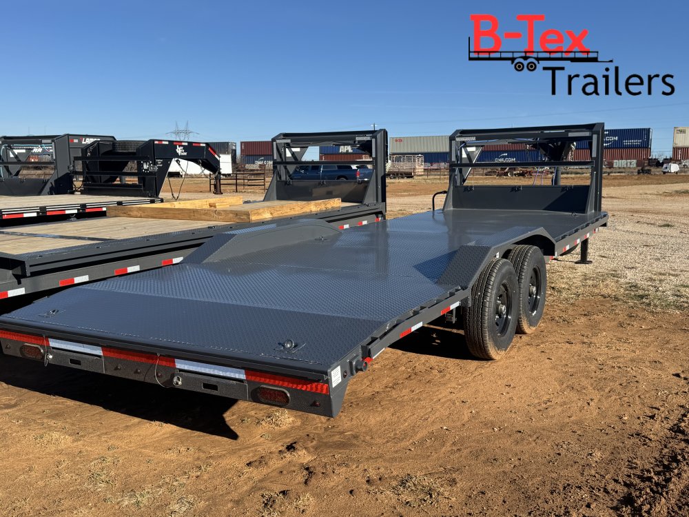 New 2026 Lamar 24’ Equipment Hauler 11 Gauge diamond plate deck Drive over fenders 102 wide Tandem 7k axles Tool box in neck Gooseneck hitch Slide in ramps Spare tire Rear Stabilizer Jacks 6 In floor D rings 9400# capacity 14k GVWR