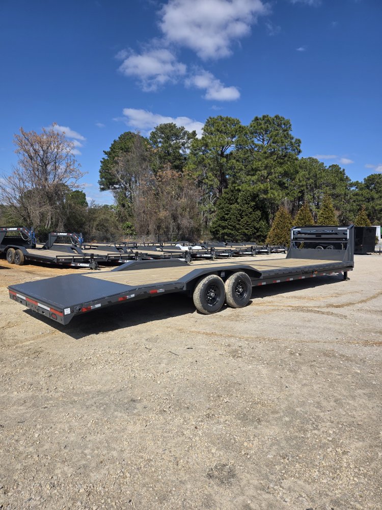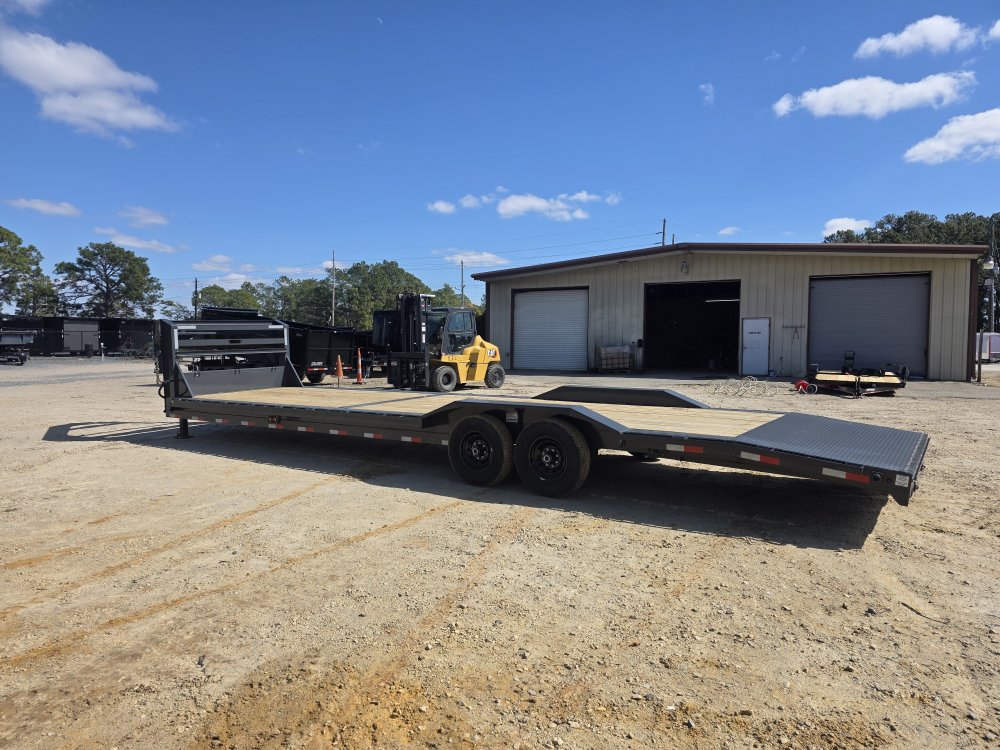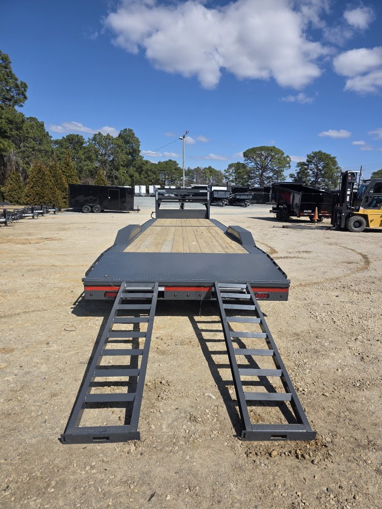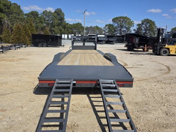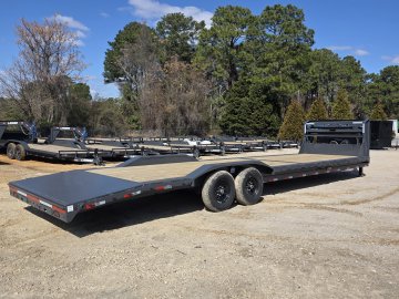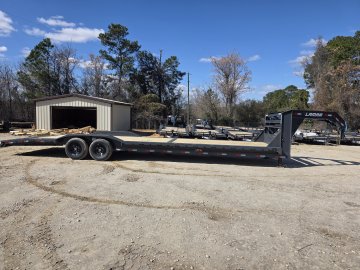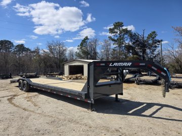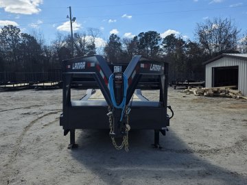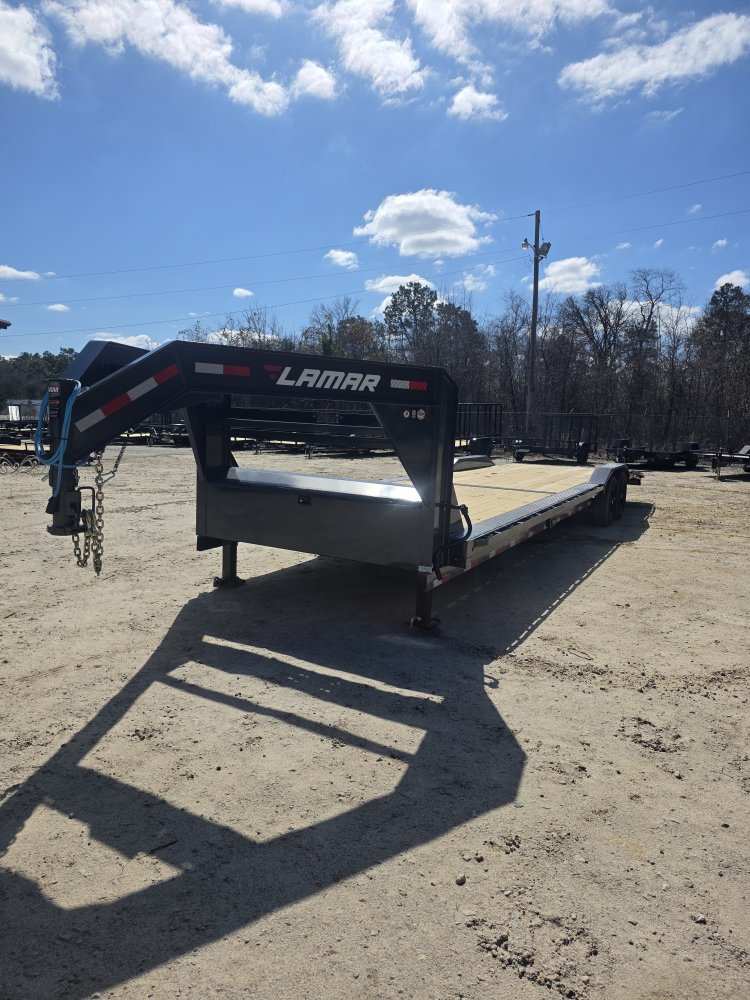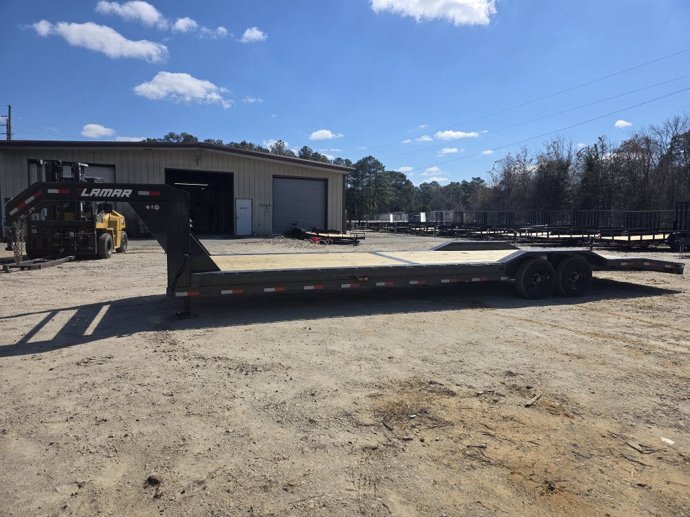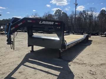 The Lamar Model H8023227 Gooseneck is a heavy-duty equipment trailer built for demanding hauling tasks, featuring Lamar’s robust 8” channel main frame and tandem axle configuration that delivers strong load-carrying capability and long-lasting durability. It’s gooseneck design includes a 2-5/16” adjustable coupler rated up to 30,000 lbs for secure towing, and dual 10,000 lb drop-leg jacks for stable support when disconnected. The trailer deck is finished with treated wood and supported by closely spaced crossmembers, while heavy-duty slide-in ramps make loading and unloading machinery straight forward. Standard features like tool box with gas-scock lid, DOT-approved LED lighting, weather resistant wiring.