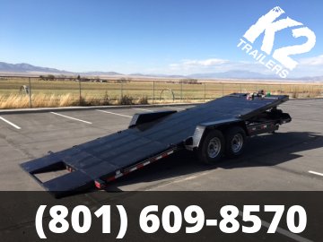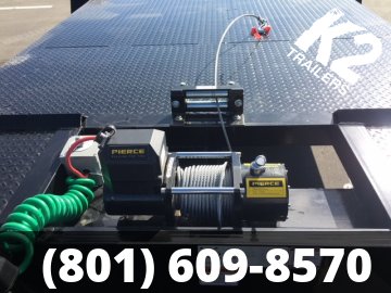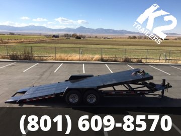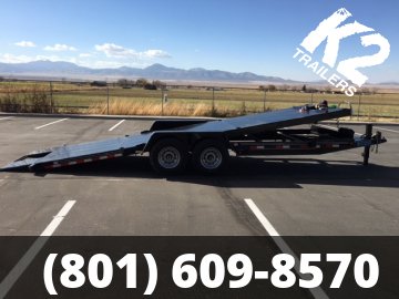 Our 15,000 GVWR Diamond floor tilt car trailers are manufactured with a 6 channel frame and tongue, and 6x2 heavy wall tubing on the full length tilting bed, with 3 channel cross members on 16 centers. The entire bed tilts for loading and is built with all tubing steel perimeter frame construction. 24 toe plates and the gradual loading angle, made possible by a total bed length (including toe plates) of 24, make it possible to load vehicles or equipment with low clearance that will not load on standard ramp and dovetail trailers. A hydraulic damper cushions the lowering of the bed during loading. There is a convenient one-handle latch system to secure the bed in the towing position once loading is complete. This diamond floor tilting bed car trailer also includes a 12k drop foot jack, diamond plate fenders, four-wheel brakes, radial tires, stake pockets with rub rail, and a sealed modular wiring harness with lifetime LED lights.