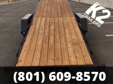 Our 15,000 GVWR Diamond floor tilt car trailers are manufactured with a 6 channel frame and tongue, and 6x2 heavy wall tubing on the full length tilting bed, with 3 channel cross members on 16 centers. The entire bed tilts for loading and is built with all tubing steel perimeter frame construction. 24 toe plates and the gradual loading angle, made possible by a total bed length (including toe plates) of 24, make it possible to load vehicles or equipment with low clearance that will not load on standard ramp and dovetail trailers. A hydraulic damper cushions the lowering of the bed during loading. There is a convenient one-handle latch system to secure the bed in the towing position once loading is complete. This diamond floor tilting bed car trailer also includes a 12k drop foot jack, diamond plate fenders, four-wheel brakes, radial tires, stake pockets with rub rail, and a sealed modular wiring harness with lifetime LED lights.