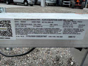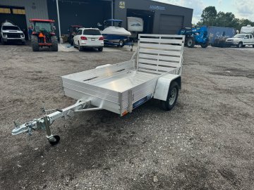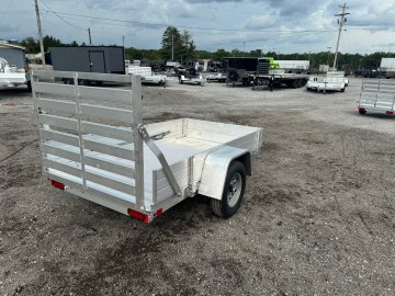 2000# Rubber torsion axle - No brakes - Easy lube hubs, ST175/80R13 LRC Radial tires (1360# cap/tire) Steel wheels, 5-4.5 BHP, 12" Solid side kit, Aluminum fenders, Extruded aluminum floor, 6" Front retaining bumper, A-Framed aluminum tongue, 48" long with 2" coupler 4) Stake pockets (2 per side) 4-Tie down loops (2 per side) Swivel tongue jack, 1200# capacity, LED Lighting package, safety chains Aluminum tailgate - 50.25" x 39" long Overall width = 75.5" Overall length = 145"