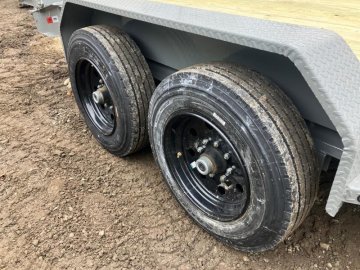 ###### **16000 lb. G.V.W.R. Can be de-rated to 9990 if desired, Electric Breakaway with battery, Diamond Plate Fenders, 2' Dovetail with 5' Fold up Ramps, 83" Deck Width.**
