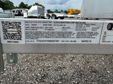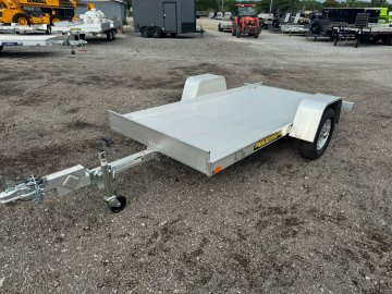 2000# Rubber torsion axle - No brakes - Easy lube hubs, ST175/80R13 LRC Radial tires (1360# cap/tire) Aluminum wheels, 5-4.5 BHP Aluminum fenders Extruded aluminum floor 6" Extruded front retaining bumper 3" Formed aluminum tongue, 48" long, 2" coupler, riser for proper hitch height 4) Stake pockets (2 per side) 4-Tie down loops (2 per side) Swivel tongue jack, 1200# capacity LED Lighting package, safety chains Overall width = 75.5" Overall length = 168" Gas cylinder to raise bed for loading 15° tilt
