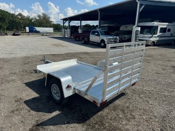 2000# Rubber torsion axle - No brakes - Easy lube hubs ST175/80R13 LRC Radial tires (1360# cap/tire) Aluminum wheels, 5-4.5 BHP Aluminum fenders, Extruded aluminum floor, 6" Front retaining bumper, A-Framed aluminum tongue, 48" long with 2" coupler 4-Stake pockets (2 per side) 4-Tie down loops (2 per side) Swivel tongue jack, 1200# capacity, LED Lighting package, safety chains, Aluminum tailgate / bi-fold tailgate - 59.25" x 39" long Overall width = 84.5" Overall length = 145"