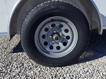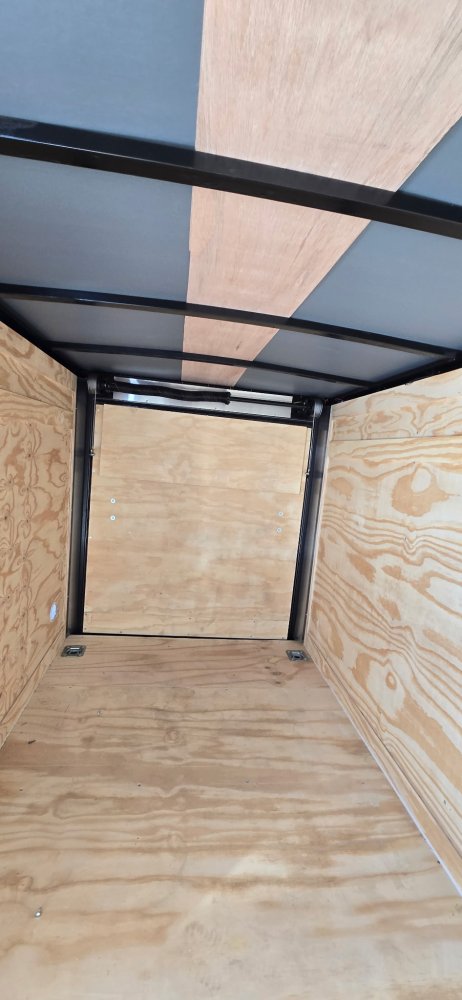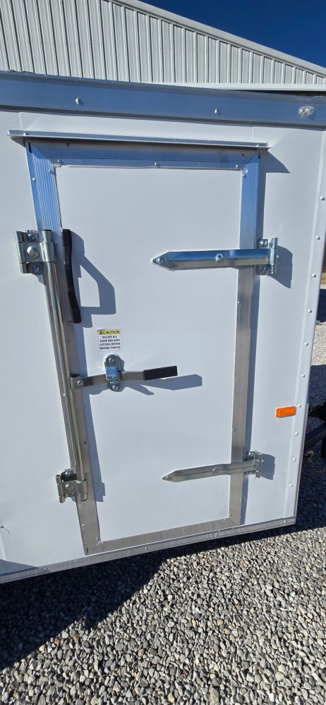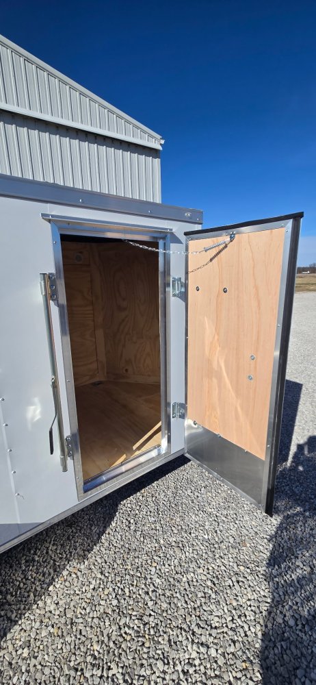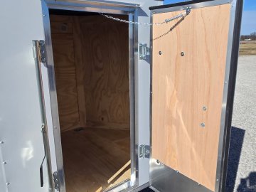 This trailer features a sturdy 3" steel tube main frame with 24" on-center roof bows and floor cross members, and 16" on sidewalls. It has a durable ¾" plywood floor and 3/8" plywood walls, along with a Therma Cool ceiling liner. Entry is convenient with a 24" side door and a 12-volt LED dome light. It rides on a 2990 lbs. drop leaf spring axle with silver mod wheels and aluminum fenders, plus E-Z Lube hubs. Other features include a 2" coupler, 24" stone guard, V-nose design, and LED lighting throughout. For securing cargo, you'll find 4 floor mount D-rings, and it connects with a flat 4 pigtail.