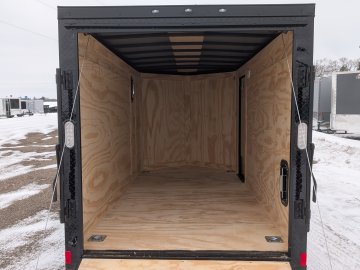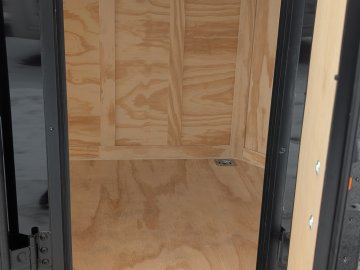 This trailer features a sturdy 3" steel tube main frame with 16" on-center roof bows and sidewalls, and 24" on-center floor cross members. It has a durable ¾" plywood floor and 3/8" plywood walls, along with a Therma Cool ceiling liner. Entry is convenient with a 24" side door and a 12-volt LED dome light. It rides on a 2990 lbs. drop leaf spring axle with silver mod wheels and aluminum fenders, plus E-Z Lube hubs. Other features include a 2" coupler, 24" stone guard, V-nose design, and LED lighting throughout. For securing cargo, you'll find 4 floor mount D-rings, and it connects with a flat 4 pigtail.