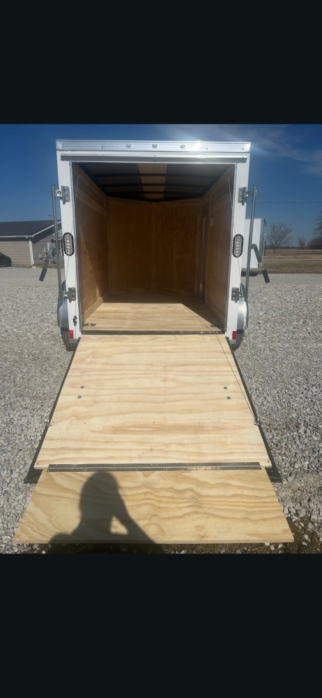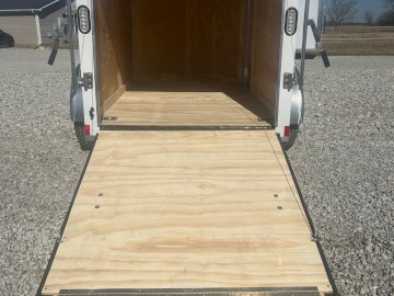 This trailer features a sturdy 3" steel tube main frame with 24" on-center roof bows and floor cross members, and 16" on sidewalls. It has a durable ¾" plywood floor and 3/8" plywood walls, along with a Therma Cool ceiling liner. Entry is convenient with a 24" side door and a 12-volt LED dome light. It rides on a 2990 lbs. drop leaf spring axle with silver mod wheels and aluminum fenders, plus E-Z Lube hubs. Other features include a 2" coupler, 24" stone guard, V-nose design, and LED lighting throughout. For securing cargo, you'll find 4 floor mount D-rings, and it connects with a flat 4 pigtail.