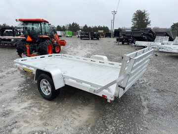 3500# Rubber torsion axle (rated at 2990#) - No brakes - Easy lube hubs, ST205/75R14 LRC Radial tires (1760# cap/tire) Aluminum wheels, 5-4.5 BHP, Aluminum fenders, Extruded aluminum floor, Front & side retaining rails, A-Framed aluminum tongue, 48" long with 2" coupler, 4-Stake pockets (2 per side) 4-Tie down loops (2 per side) Swivel tongue jack, 1200# capacity, LED Lighting package, safety chains, Aluminum tailgate - 77.5" x 44" long / Bi-fold - 77.5" x 60" long, Overall width = 101.5" Overall length =7712H - 194.5"