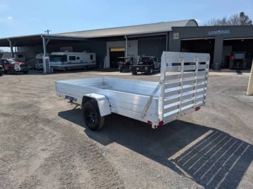 Standard Equipment,3500# Rubber torsion axle (rated at 2990#) - No brakes - Easy lube hubs, ST205/75R14 Radial tires, Steel wheels, 5-4.5 BHP, Aluminum fenders, Extruded aluminum floor, 7" Heavy-duty frame rail, A-Framed aluminum tongue, 48" long with 2" coupler, 4) Tie down loops (2 per side), Swivel tongue jack, 1200# capacity, LED Lighting package, safety chains, 12" Solid side rack kit, Aluminum tailgate = 67.25" x 44" long, Overall width = 92.5", Overall length = 199"