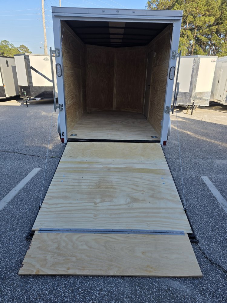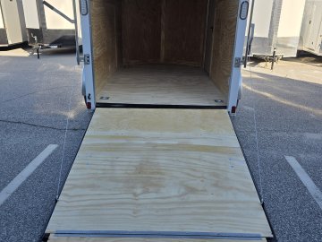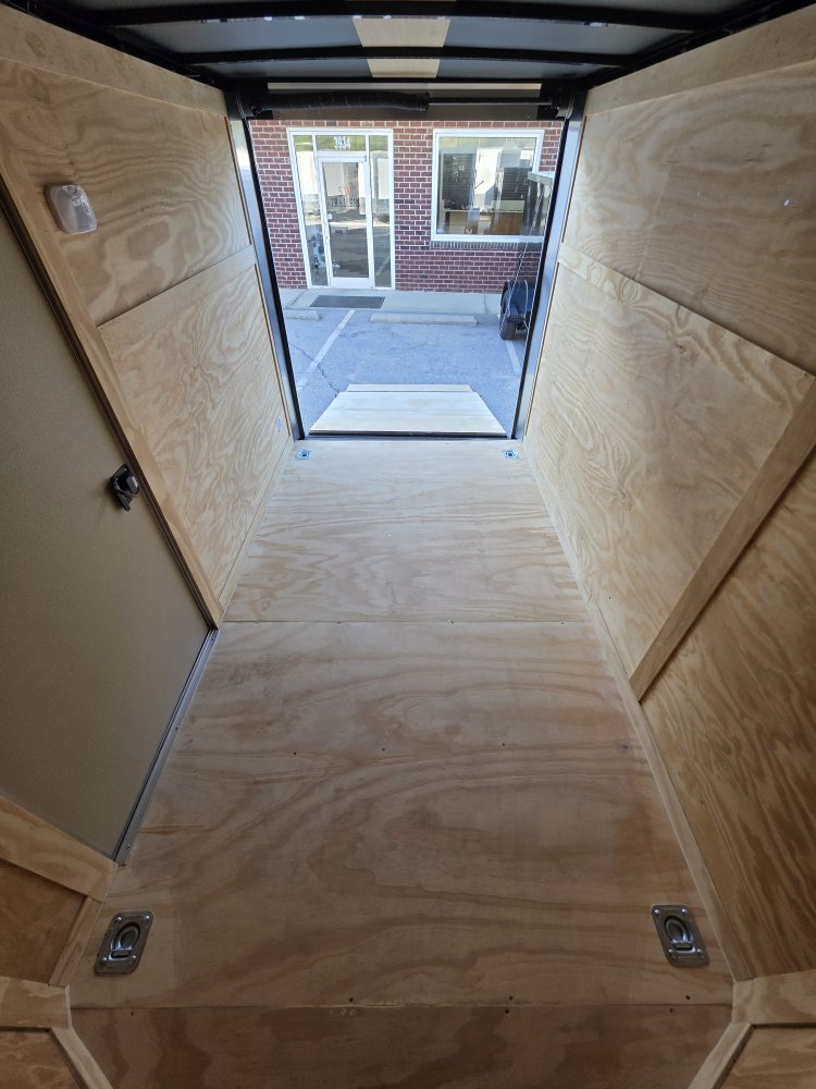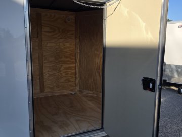 This trailer features a sturdy 3" steel tube main frame with 24" on-center roof bows and floor cross members, and 16" on sidewalls. It has a durable ¾" plywood floor and 3/8" plywood walls, along with a Therma Cool ceiling liner. Entry is convenient with a 24" side door and a 12-volt LED dome light. It rides on a 2990 lbs. drop leaf spring axle with silver mod wheels and aluminum fenders, plus E-Z Lube hubs. Other features include a 2" coupler, 24" stone guard, V-nose design, and LED lighting throughout. For securing cargo, you'll find 4 floor mount D-rings, and it connects with a flat 4 pigtail.