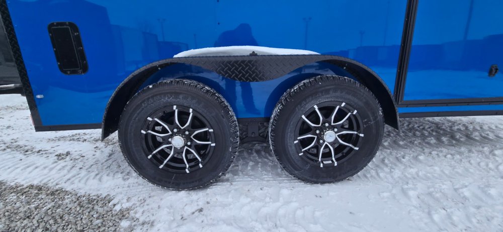 Features a striking Black Out Package, highlighted by all black trim and sleek black ATP fenders. It boasts a black stone guard and V-nose for a unified aesthetic, complemented by black ATP stepwells on 8.5' wide models. The look is completed with black barlocks, aluminum wheels with black inlay, and black aluminum side vents, creating a bold and cohesive appearance.