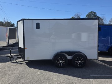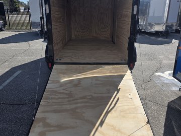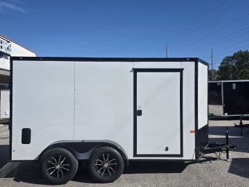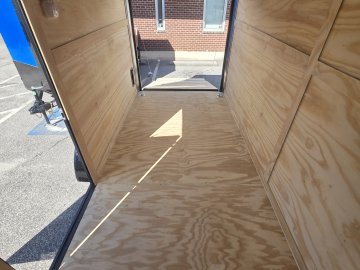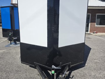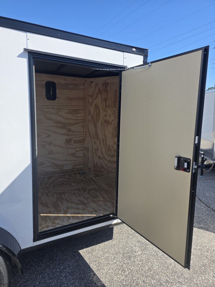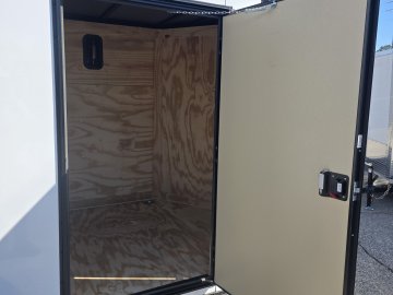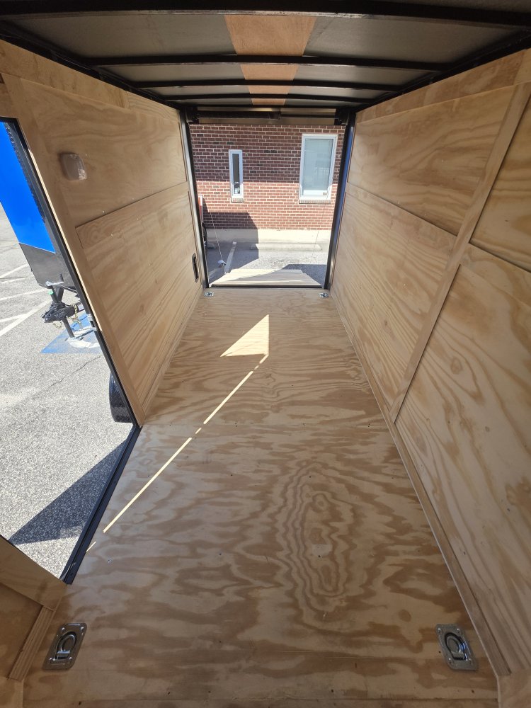 This robust trailer is built with a 4" steel tube main frame and features 24" on-center spacing for the roof bows, and 16” on floor cross members, and sidewalls, ensuring exceptional durability. It boasts a hard-wearing ¾" plywood floor and 3/8" plywood walls, complemented by a Therma Cool ceiling liner. Access is convenient through a 36" side door with a flush lock, illuminated by a 12-volt LED dome light. It's equipped with 3500 lbs. drop leaf spring axles, electric brakes on both axles, and E-Z Lube hubs on silver mod wheels with aluminum fenders. Other key features include a 2 5/16" coupler, 24" stone guard, a sleek V-nose design, and full LED lighting. Inside, you'll find 4 floor mount D-rings to secure your cargo, and it connects easily with a 7-way Bargman plug.