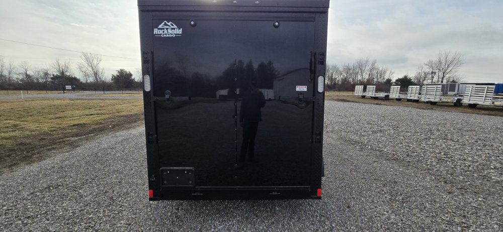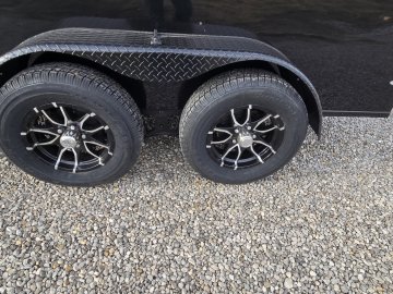 Features a striking Black Out Package, highlighted by all black trim and sleek black ATP fenders. It boasts a black stone guard and V-nose for a unified aesthetic, complemented by black ATP stepwells on 8.5' wide models. The look is completed with black barlocks, aluminum wheels with black inlay, and black aluminum side vents, creating a bold and cohesive appearance.