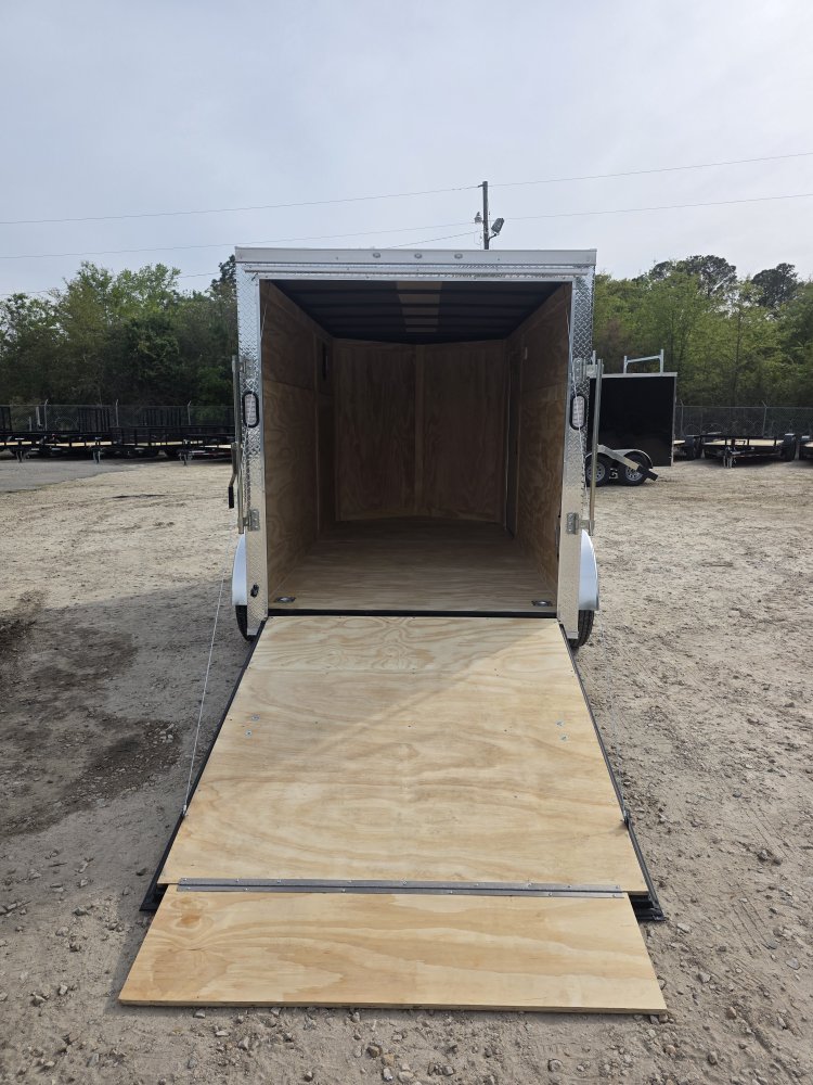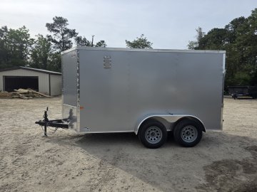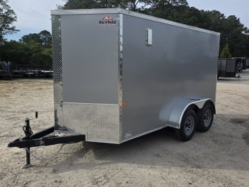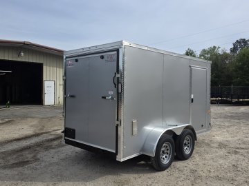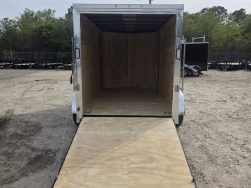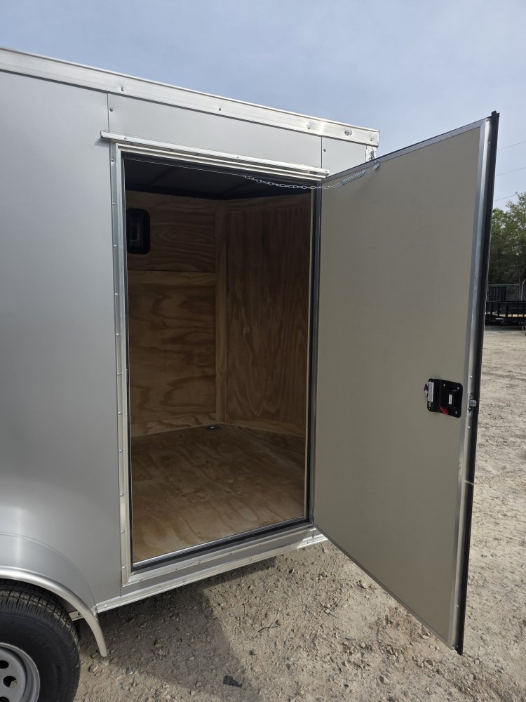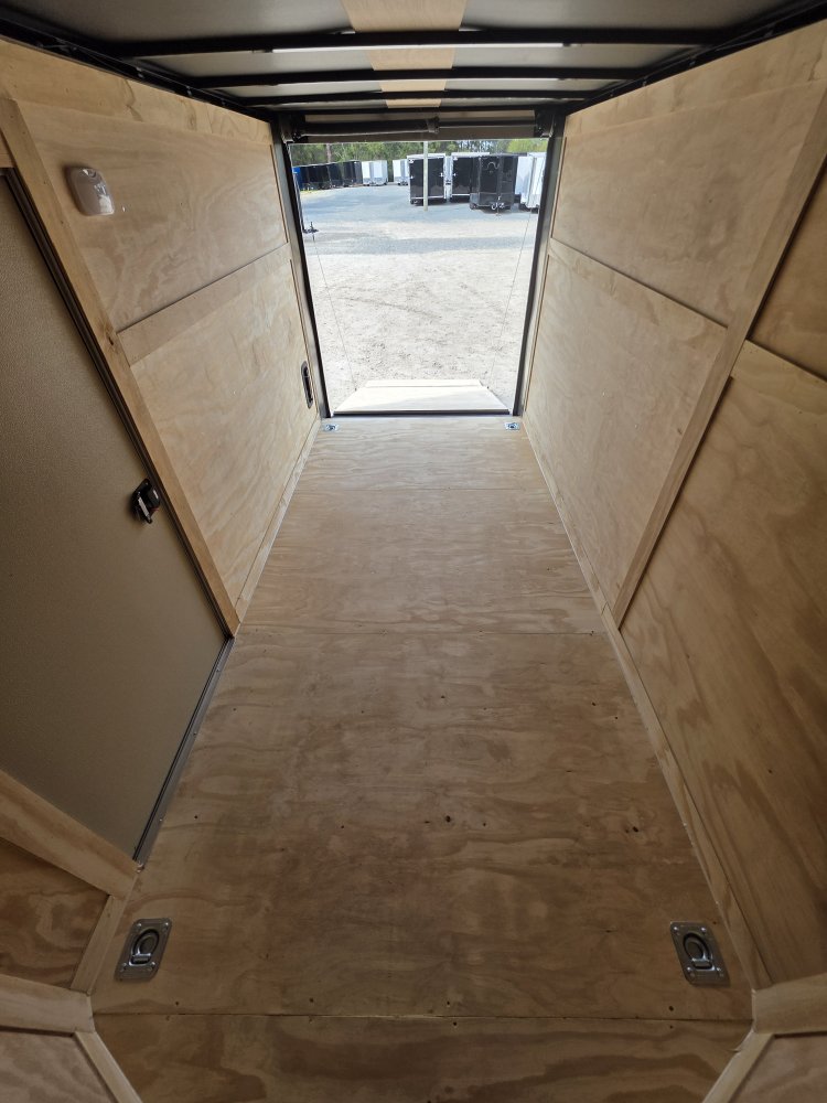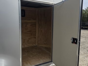 This robust trailer is built with a 4" steel tube main frame and features 24" on-center spacing for the roof bows, and 16” on floor cross members, and sidewalls, ensuring exceptional durability. It boasts a hard-wearing ¾" plywood floor and 3/8" plywood walls, complemented by a Therma Cool ceiling liner. Access is convenient through a 36" side door with a flush lock, illuminated by a 12-volt LED dome light. It's equipped with 3500 lbs. drop leaf spring axles, electric brakes on both axles, and E-Z Lube hubs on silver mod wheels with aluminum fenders. Other key features include a 2 5/16" coupler, 24" stone guard, a sleek V-nose design, and full LED lighting. Inside, you'll find 4 floor mount D-rings to secure your cargo, and it connects easily with a 7-way Bargman plug.