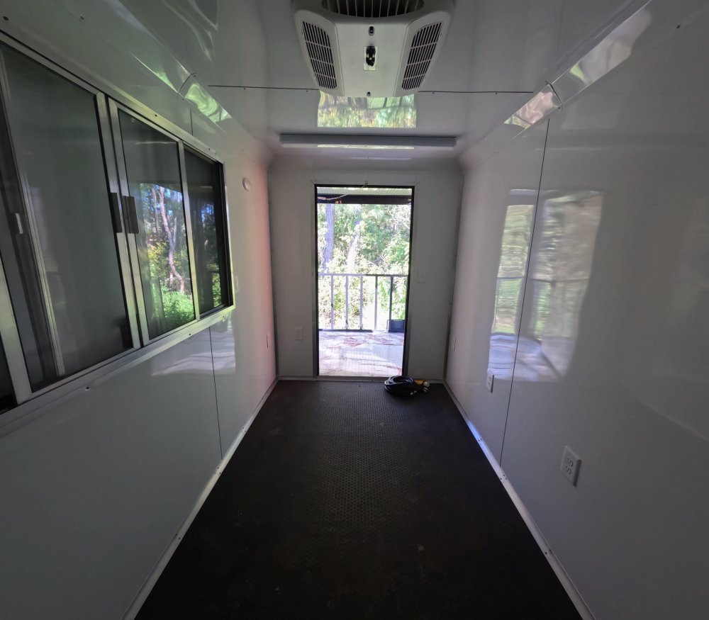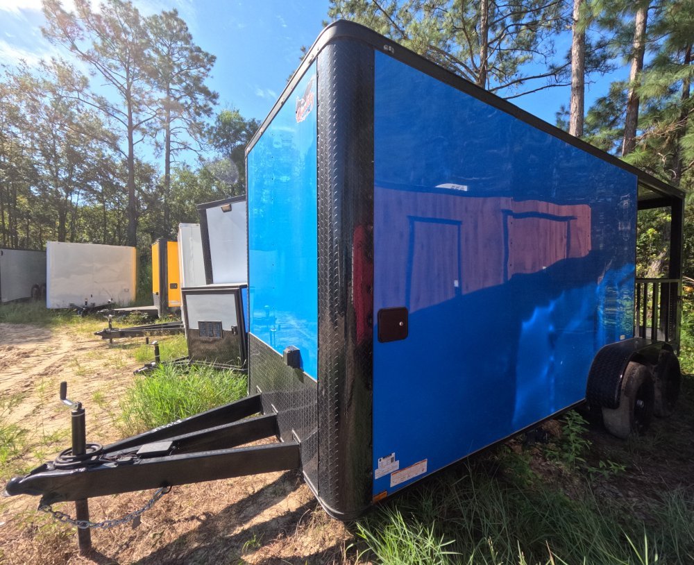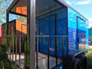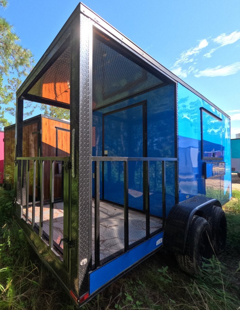12’ Cabin with 6’ Porch Featuring Rails, Removable Rear Section, and Swing Gate