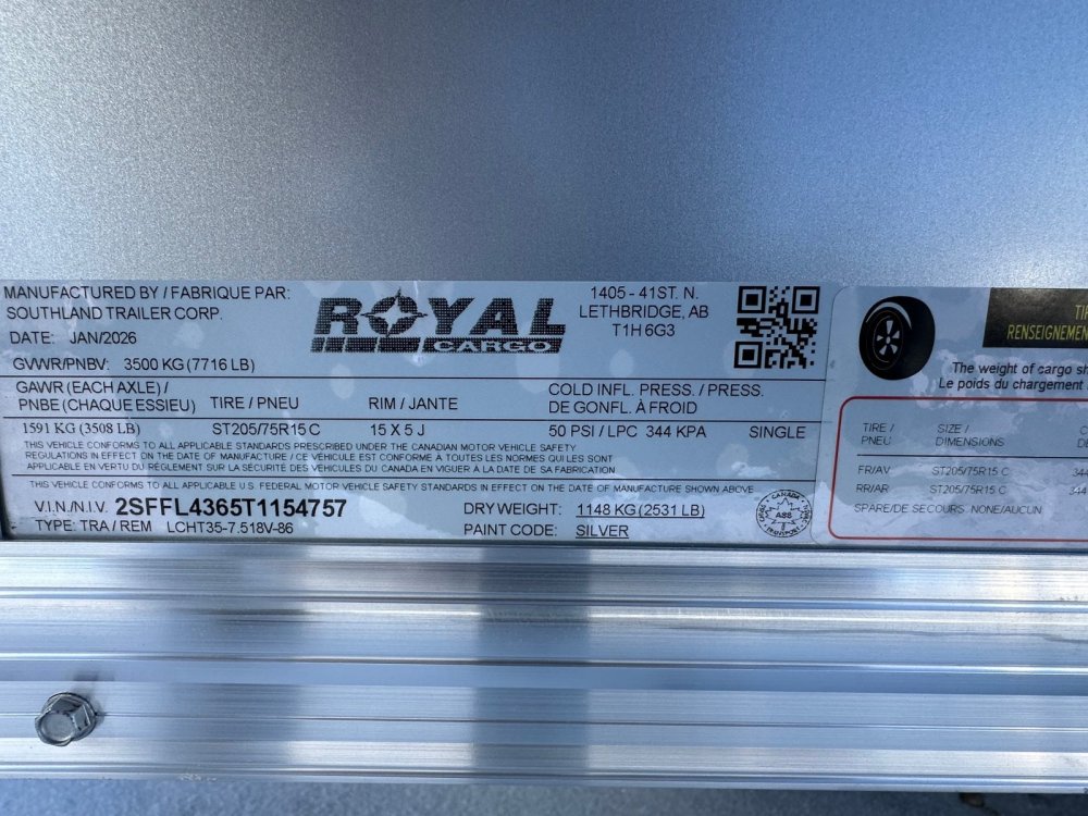 7' 6"x16+vnose Southland Royal Cargo LCHT35-7.518V-86 Enclosed