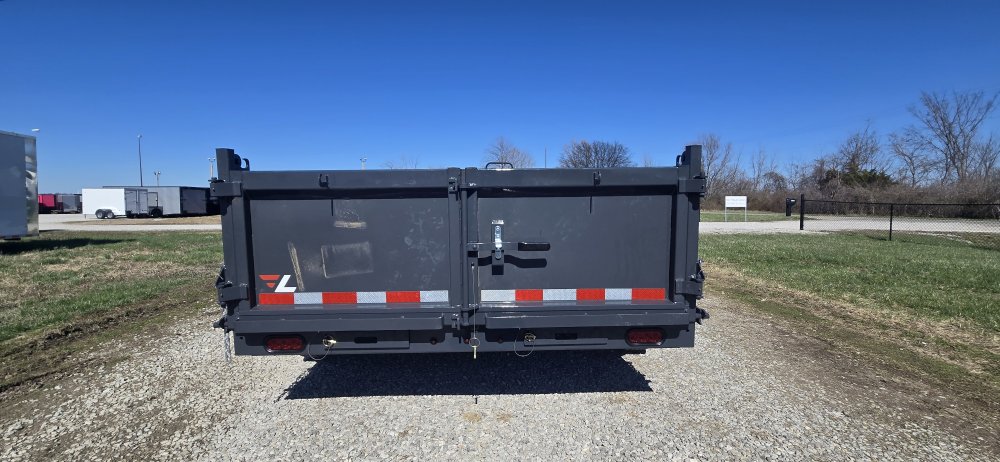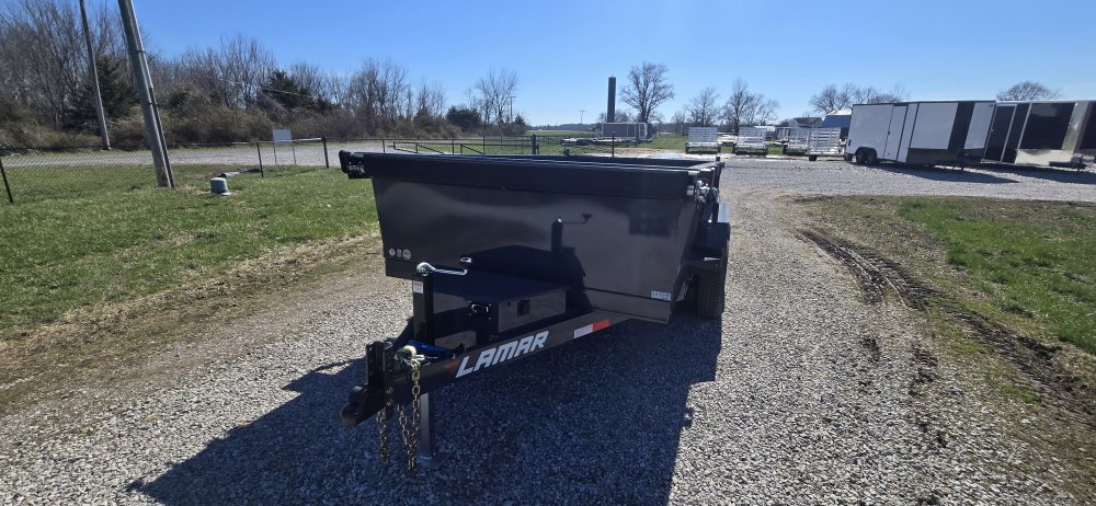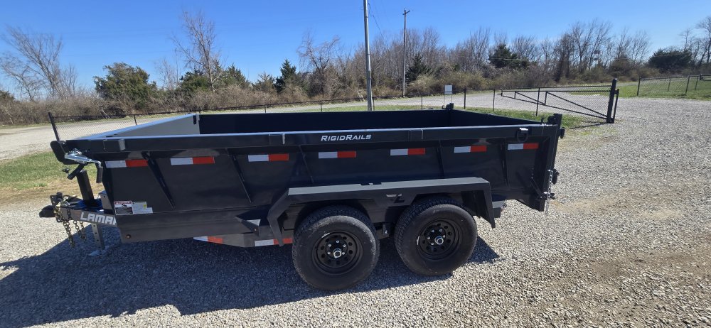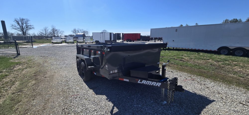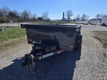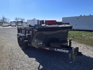 The Lamar Dump Trailer Model DM771225 is a medium-sized, low-profile trailer with a 9,990 lb. GVWR, making it ideal for both commercial use and homeowners. Its 77-inch width allows for easy maneuverability in tight spaces, and it is a popular choice for hauling landscaping materials, construction debris, or general trash. The trailer comes standard with a durable 5-inch channel frame, a hydraulic scissor lift for efficient dumping, and 18-inch weld-on sides. It also includes an easy-roll mesh tarp, a front toolbox, and rear barn doors. The construction features a premium powder coat finish and a cold-rated wiring harness for long-lasting durability. With a payload capacity of approximately 7,340 lbs. and a dump capacity of 5.7 cubic yards, it is a versatile and reliable trailer for a variety of jobs