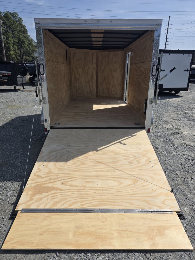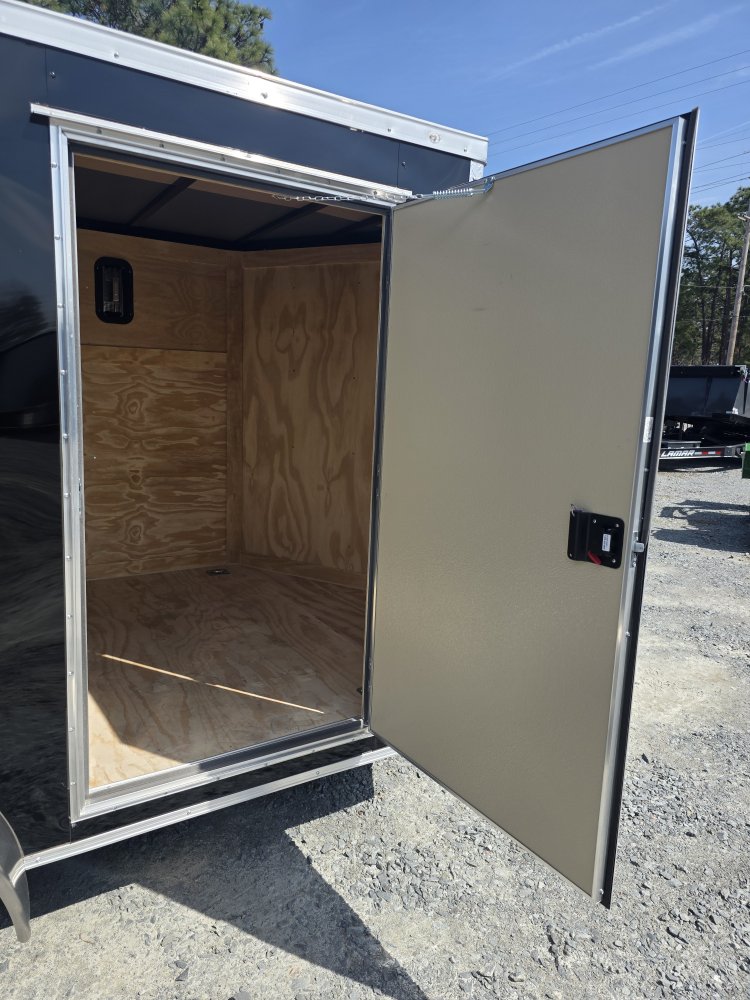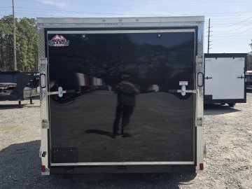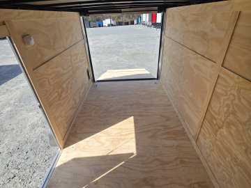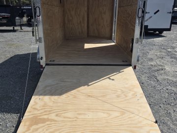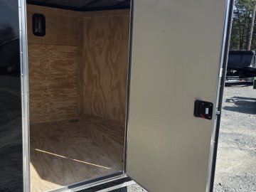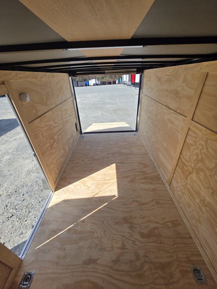 This heavy-duty enclosed trailer is built with a robust 4" steel tube main frame and features 24" on-center spacing for the roof bows, and 16” on floor cross members, and sidewalls for superior strength. It includes a durable ¾" plywood floor and 3/8" plywood walls, along with a Therma Cool ceiling liner for climate control. Access is convenient through a 36" side door with a flush lock, illuminated by a 12-volt LED dome light. It rides smoothly on 3500 lbs. drop leaf spring axles equipped with electric brakes on both axles and E-Z Lube hubs, all on silver mod wheels with aluminum fenders. Additional features include a 2 5/16" coupler, 24" stoneguard,a streamlined V-nose design, and full LED lighting. Inside, 4 floor mount D-rings help secure your cargo, and it connects easily with a 7-way Bargman plug.