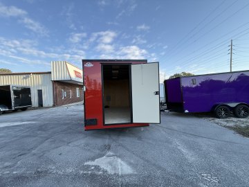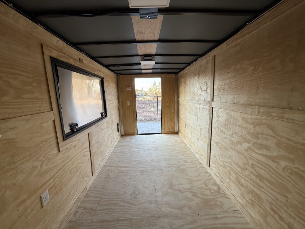 This heavy-duty enclosed trailer is built with a robust 4" steel tube main frame and features 24" on-center spacing for the roof bows, and 16” on floor cross members, and sidewalls for superior strength. It includes a durable ¾" plywood floor and 3/8" plywood walls, along with a Therma Cool ceiling liner for climate control. Access is convenient through a 36" side door with a flush lock, illuminated by a 12-volt LED dome light. It rides smoothly on 3500 lbs. drop leaf spring axles equipped with electric brakes on both axles and E-Z Lube hubs, all on silver mod wheels with aluminum fenders. Additional features include a 2 5/16" coupler, 24" stone guard, a streamlined V-nose design, and full LED lighting. Inside, 4 floor mount D-rings help secure your cargo, and it connects easily with a 7-way Bargman plug.