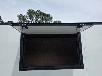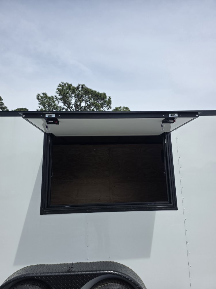 This Concession Trailer Package is designed for efficient roadside sales and service, featuring a practical layout for easy operation. Access is managed through a full-sized 36" x 78" rear side door for seamless entry and exit. The main serving area includes a 3' x 5' concession door positioned 36" above the finished floor and on the center of the passenger side, perfect for customer interaction. The included electrical package ensures you're ready to operate, providing power via a 60 AMP box with a 50 AMP motorbase and a 50 AMP twist-lock cord. Interior illumination is provided by two bright 12" x 12" LED 100-volt lights, controlled by a single switch, and complemented by two conveniently placed receptacles for your essential equipment.