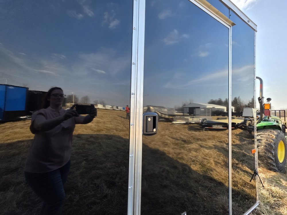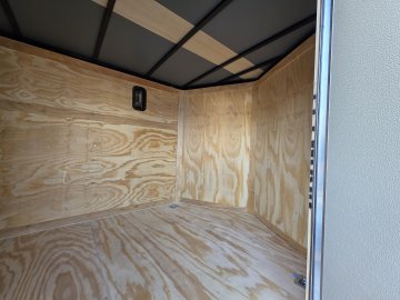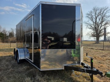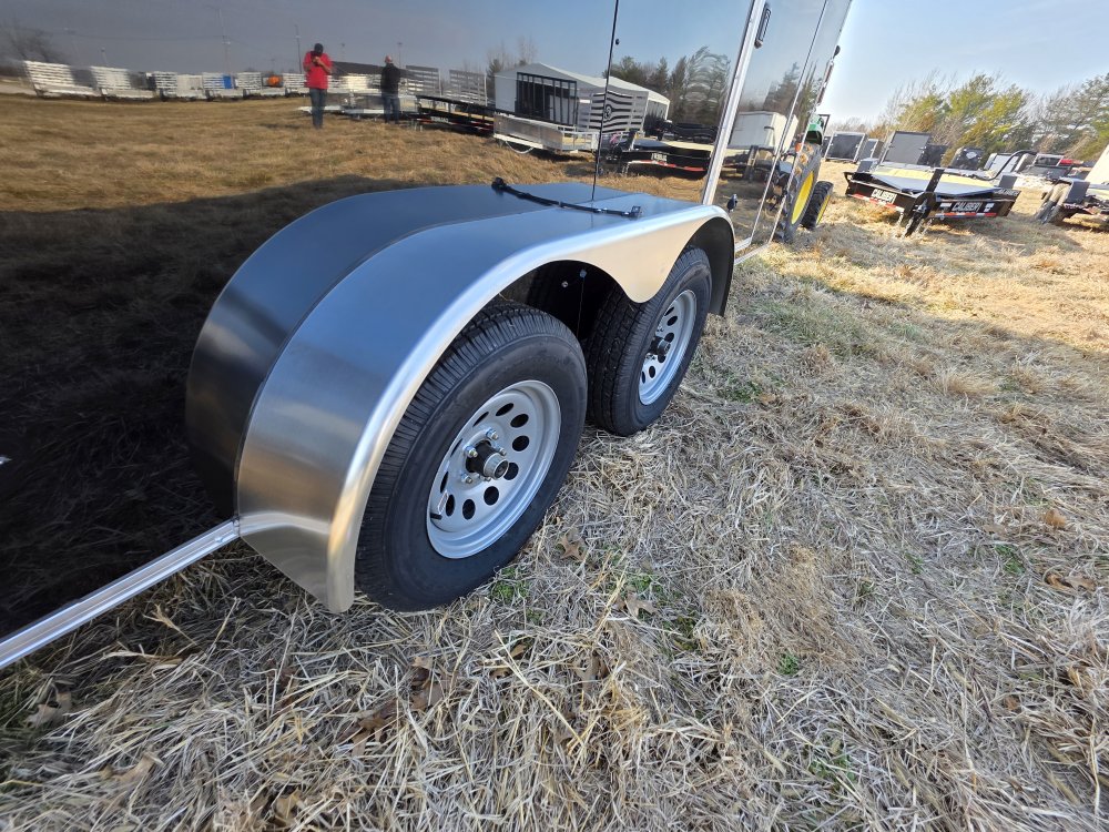 This heavy-duty enclosed trailer is built with a robust 4" steel tube main frame and features 24" on-center spacing for the roof bows, and 16" on floor cross members, and sidewalls for superior strength. It includes a durable ¾" plywood floor and 3/8" plywood walls, along with a Therma Cool ceiling liner for climate control. Access is convenient through a 36" side door with a flush lock, illuminated by a 12-volt LED dome light. It rides smoothly on 3500 lbs. drop leaf spring axles equipped with electric brakes on both axles and E-Z Lube hubs, all on silver mod wheels with aluminum fenders. Additional features include a 2 5/16" coupler, 24" stone guard, a streamlined V-nose design, and full LED lighting. Inside, 4 floor mount D-rings help secure your cargo, and it connects easily with a 7-way Bargman plug.