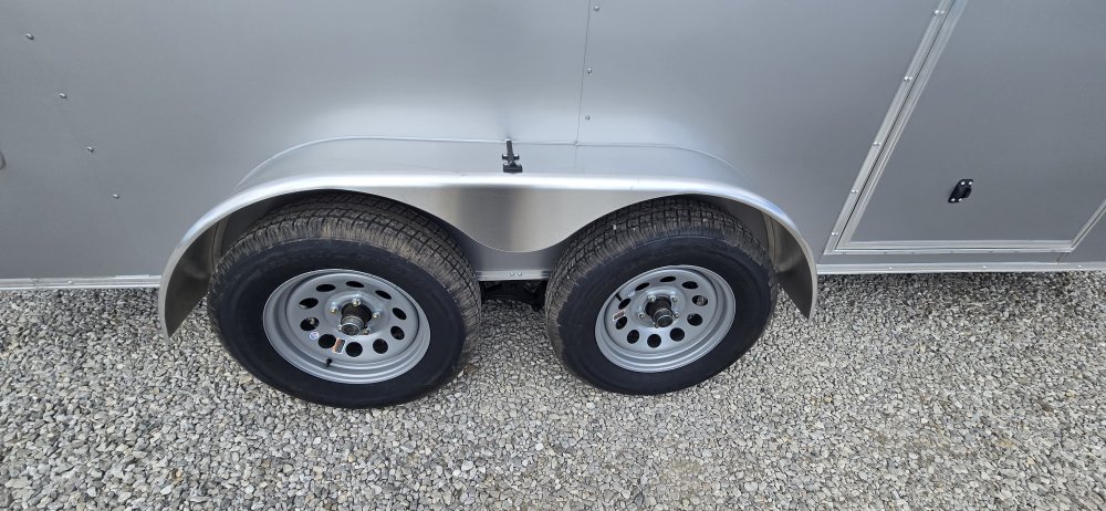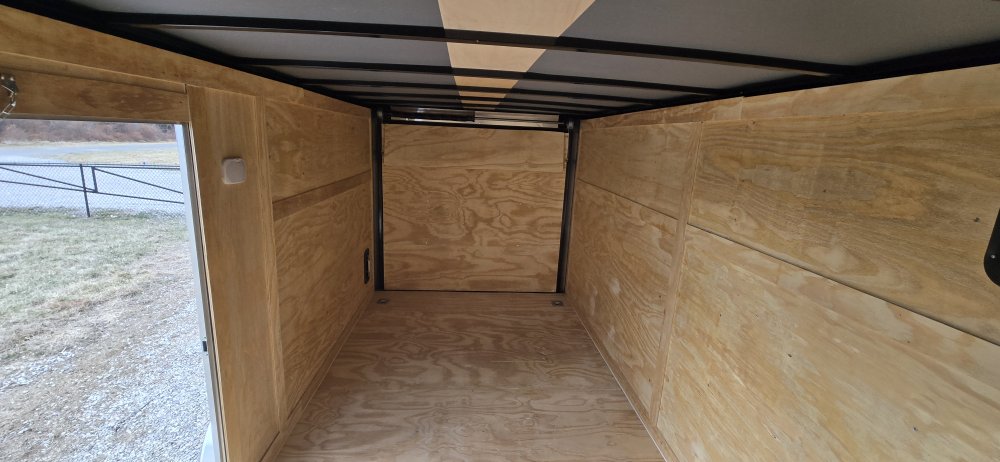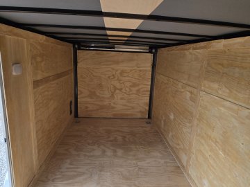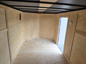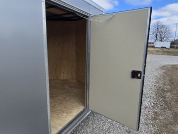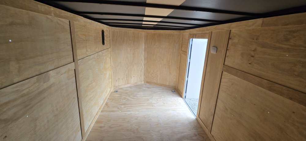 This heavy-duty enclosed trailer is built with a robust 4" steel tube main frame and features 24" on-center spacing for the roof bows, and 16” on floor cross members, and sidewalls for superior strength. It includes a durable ¾" plywood floor and 3/8" plywood walls, along with a Therma Cool ceiling liner for climate control. Access is convenient through a 36" side door with a flush lock, illuminated by a 12-volt LED dome light. It rides smoothly on 3500 lbs. drop leaf spring axles equipped with electric brakes on both axles and E-Z Lube hubs, all on silver mod wheels with aluminum fenders. Additional features include a 2 5/16" coupler, 24" stone guard, a streamlined V-nose design, and full LED lighting. Inside, 4 floor mount D-rings help secure your cargo, and it connects easily with a 7-way Bargman plug.