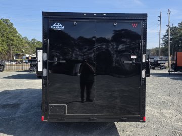 Features a striking Black Out Package, highlighted by all black trim and sleek black ATP fenders. It boasts a black stone guard and V-nose for a unified aesthetic, complemented by black ATP stepwells on 8.5' wide models. The look is completed with black barlocks, aluminum wheels with black inlay, and black aluminum side vents, creating a bold and cohesive appearance.