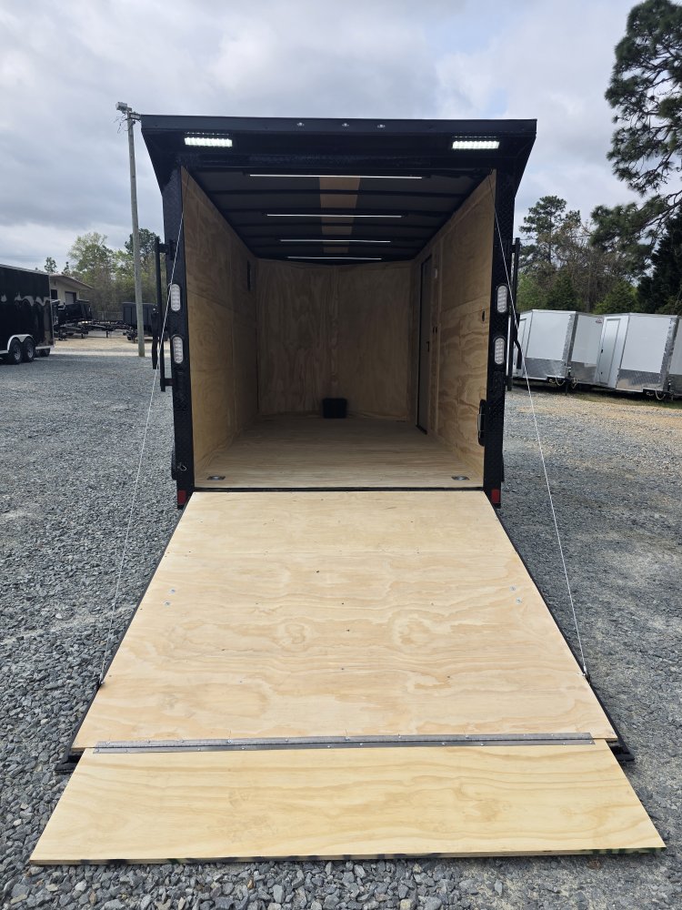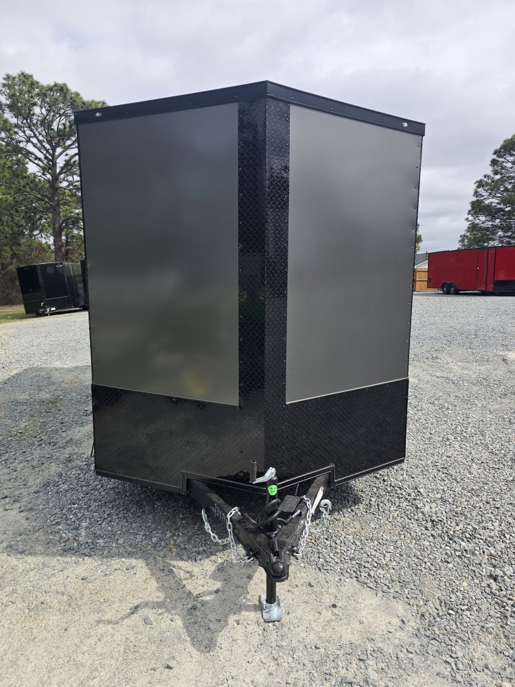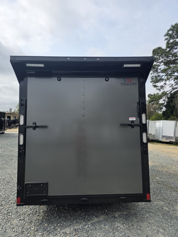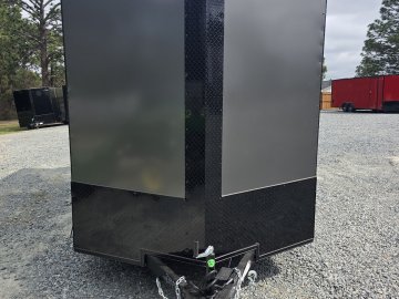 Features a striking Black Out Package, highlighted by all black trim and sleek black ATP fenders. It boasts a black stone guard and V-nose for a unified aesthetic, complemented by black ATP stepwells on 8.5' wide models. The look is completed with black barlocks, aluminum wheels with black inlay, and black aluminum side vents, creating a bold and cohesive appearance.