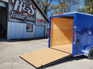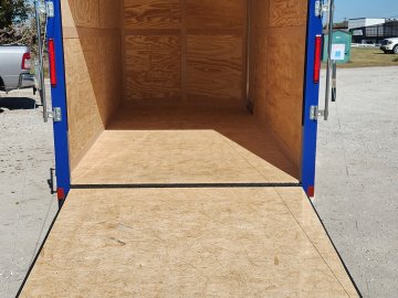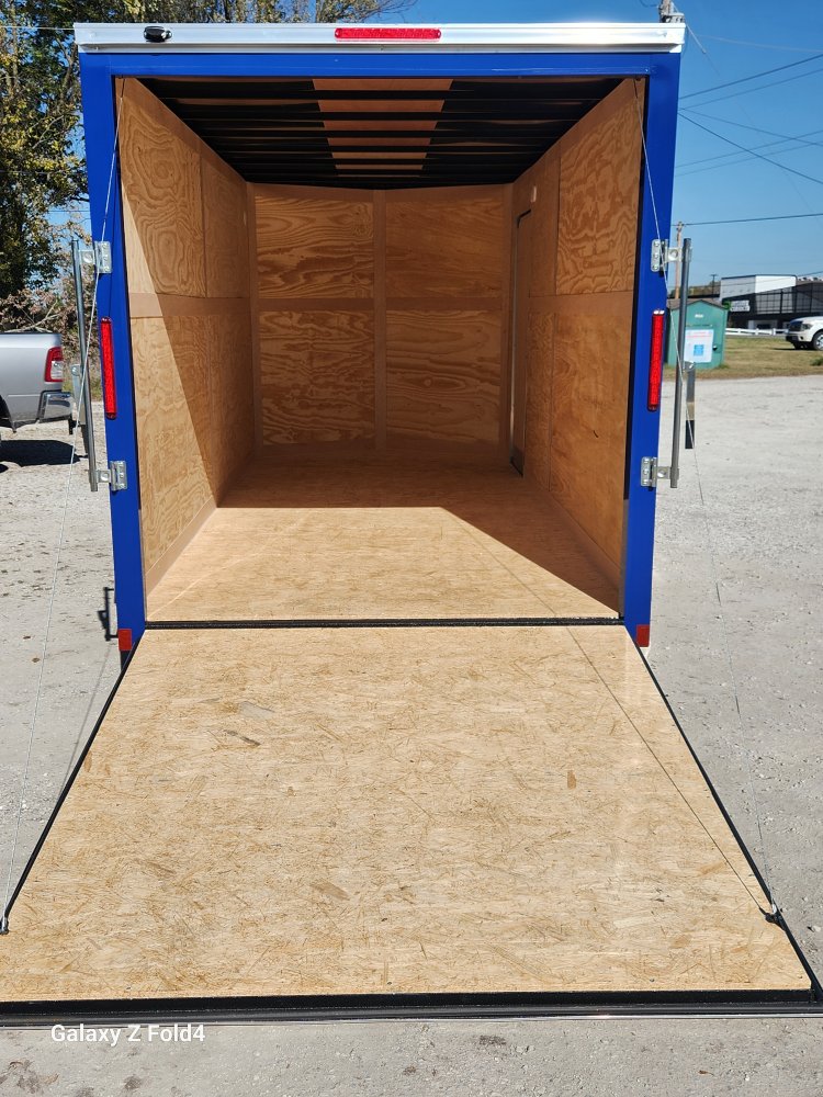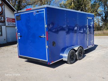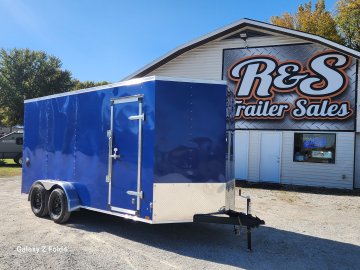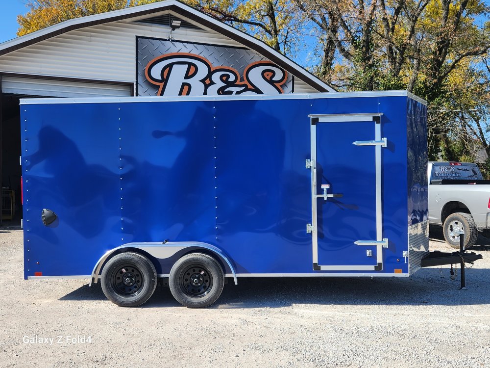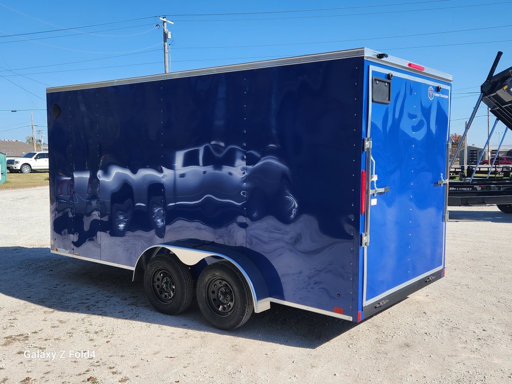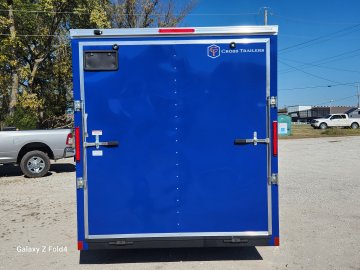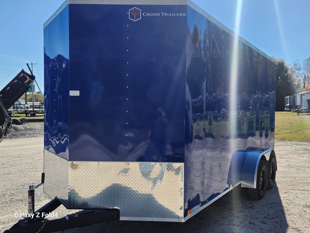 7x16 Cross Enclosed Trailer, 2-3500 lb Axles Brakes on Both Axles, Breakaway Kit, 84" Interior Height, Rear ramp Door, 32" Curbside Door . 0.30 Aluminum Exterior Deep Blue