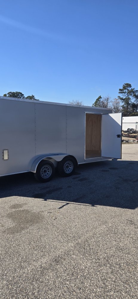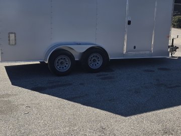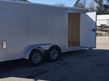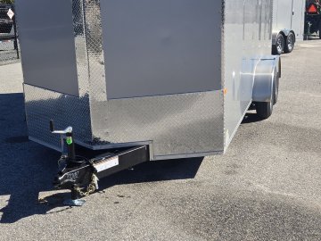 This heavy-duty enclosed trailer is built with a robust 6" steel tube main frame and features 24" on-center spacing for its roof bows, and 16” on floor cross members, and sidewalls, ensuring superior structural integrity. It boasts a durable ¾" plywood floor and 3/8" plywood walls, complemented by a Therma Cool ceiling liner for climate management. Access is convenient through a 36" side door with a flush lock, illuminated by a 12-volt LED dome light. It rides smoothly on 3500 lbs. drop leaf spring axles equipped with electric brakes on both axles and E-Z Lube hubs, all on silver mod wheels with aluminum fenders. Additional features include a 2 5/16" coupler, 24" stone guard, a streamlined V-nose design, and full LED lighting. Inside, 4 floor mount D-rings help secure your cargo, and it connects easily with a 7-way Bargman plug.