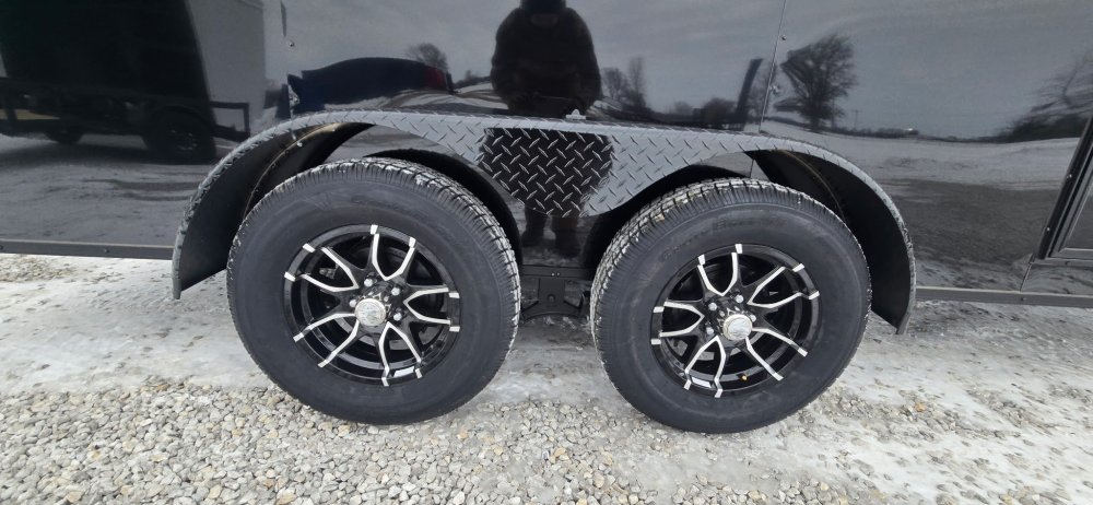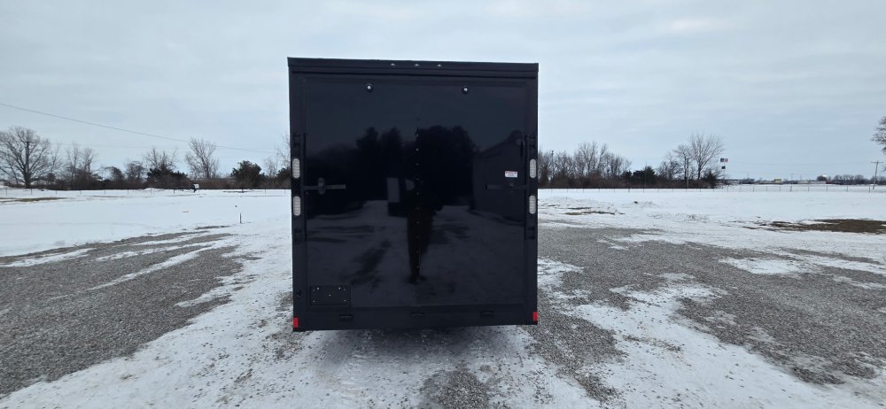 Features a striking Black Out Package, highlighted by all black trim and sleek black ATP fenders. It boasts a black stone guard and V-nose for a unified aesthetic, complemented by black ATP stepwells on 8.5' wide models. The look is completed with black barlocks, aluminum wheels with black inlay, and black aluminum side vents, creating a bold and cohesive appearance.