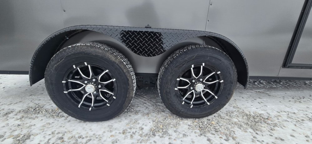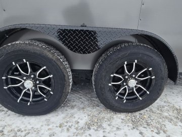 Features a striking Black Out Package, highlighted by all black trim and sleek black ATP fenders. It boasts a black stone guard and V-nose for a unified aesthetic, complemented by black ATP stepwells on 8.5' wide models. The look is completed with black barlocks, aluminum wheels with black inlay, and black aluminum side vents, creating a bold and cohesive appearance.