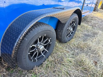 Features a striking Black Out Package, highlighted by all black trim and sleek black ATP fenders. It boasts a black stone guard and V-nose for a unified aesthetic, complemented by black ATP stepwells on 8.5' wide models. The look is completed with black barlocks, aluminum wheels with black inlay, and black aluminum side vents, creating a bold and cohesive appearance.