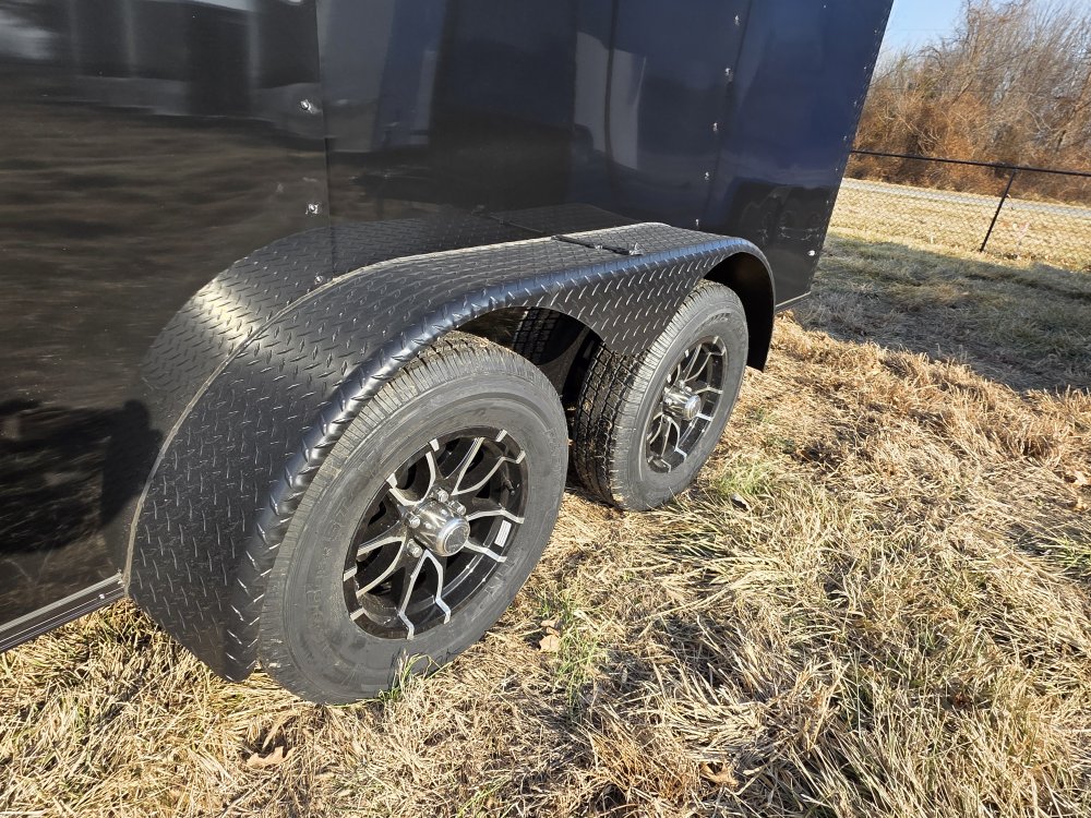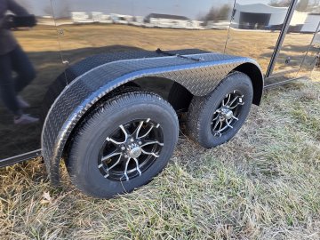 Features a striking Black Out Package, highlighted by all black trim and sleek black ATP fenders. It boasts a black stone guard and V-nose for a unified aesthetic, complemented by black ATP stepwells on 8.5' wide models. The look is completed with black barlocks, aluminum wheels with black inlay, and black aluminum side vents, creating a bold and cohesive appearance.
