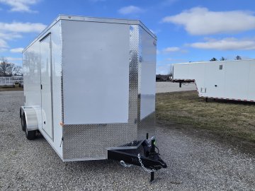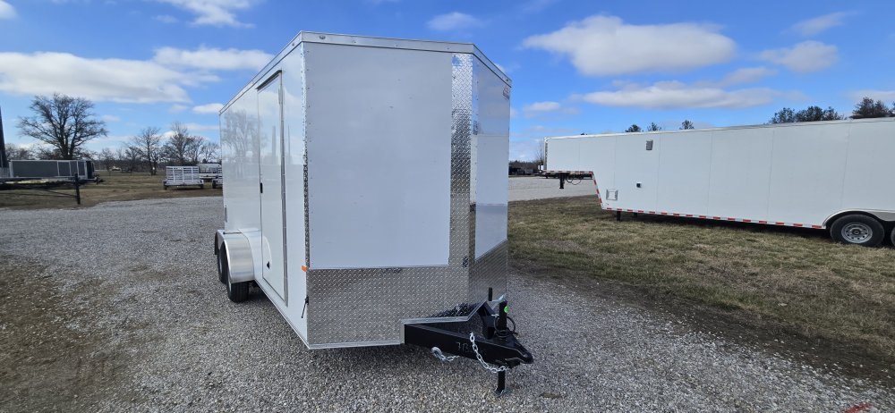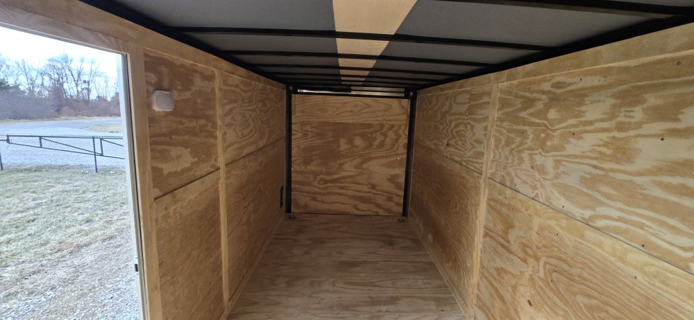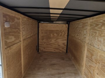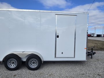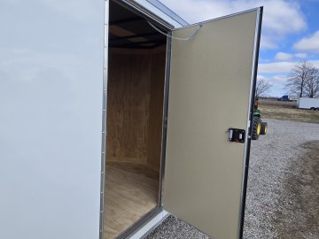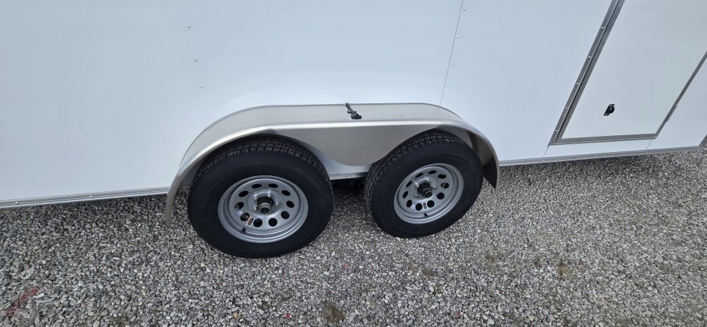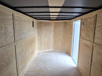 This heavy-duty enclosed trailer is built with a robust 6" steel tube main frame and features 24" on-center spacing for its roof bows, and 16” on floor cross members, and sidewalls, ensuring superior structural integrity. It boasts a durable ¾" plywood floor and 3/8" plywood walls, complemented by a Therma Cool ceiling liner for climate management. Access is convenient through a 36" side door with a flush lock, illuminated by a 12-volt LED dome light. It rides smoothly on 3500 lbs. drop leaf spring axles equipped with electric brakes on both axles and E-Z Lube hubs, all on silver mod wheels with aluminum fenders. Additional features include a 2 5/16" coupler, 24" stone guard, a streamlined V-nose design, and full LED lighting. Inside, 4 floor mount D-rings help secure your cargo, and it connects easily with a 7-way Bargman plug.