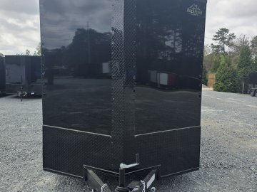 Features a striking Black Out Package, highlighted by all black trim and sleek black ATP fenders. It boasts a black stone guard and V-nose for a unified aesthetic, complemented by black ATP stepwells on 8.5' wide models. The look is completed with black barlocks, aluminum wheels with black inlay, and black aluminum side vents, creating a bold and cohesive appearance.