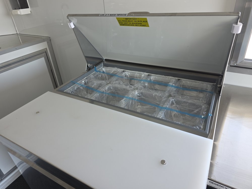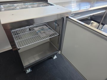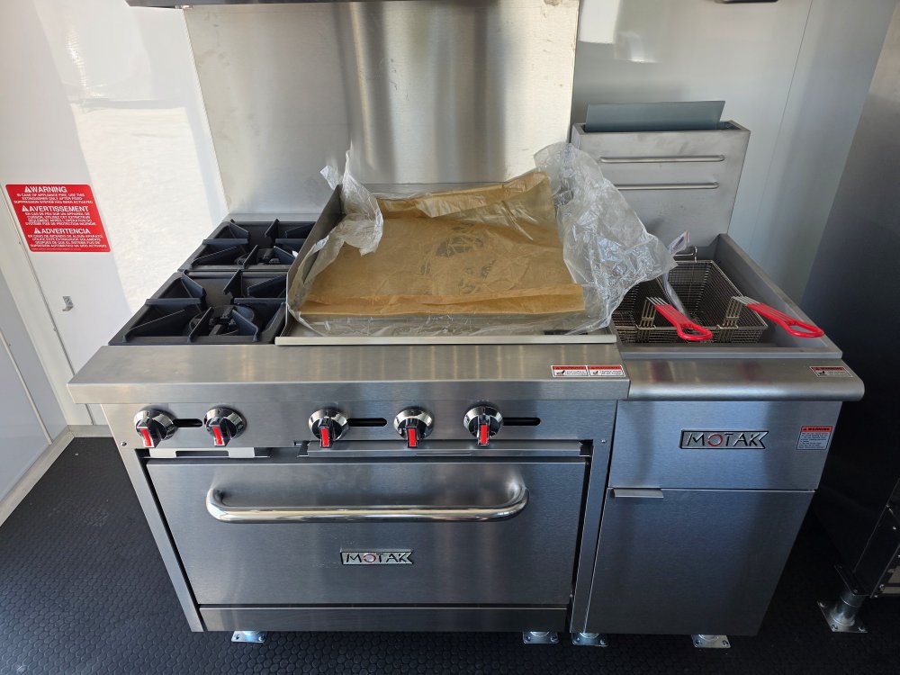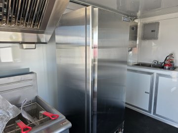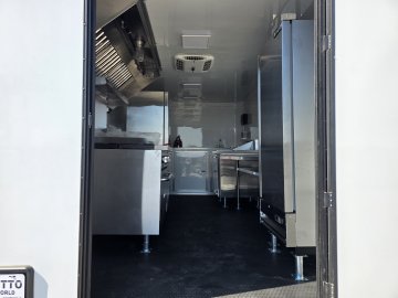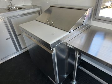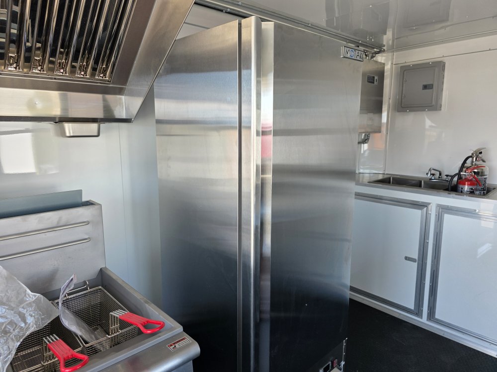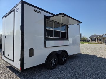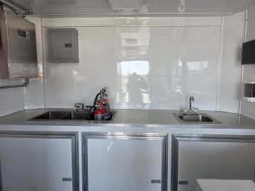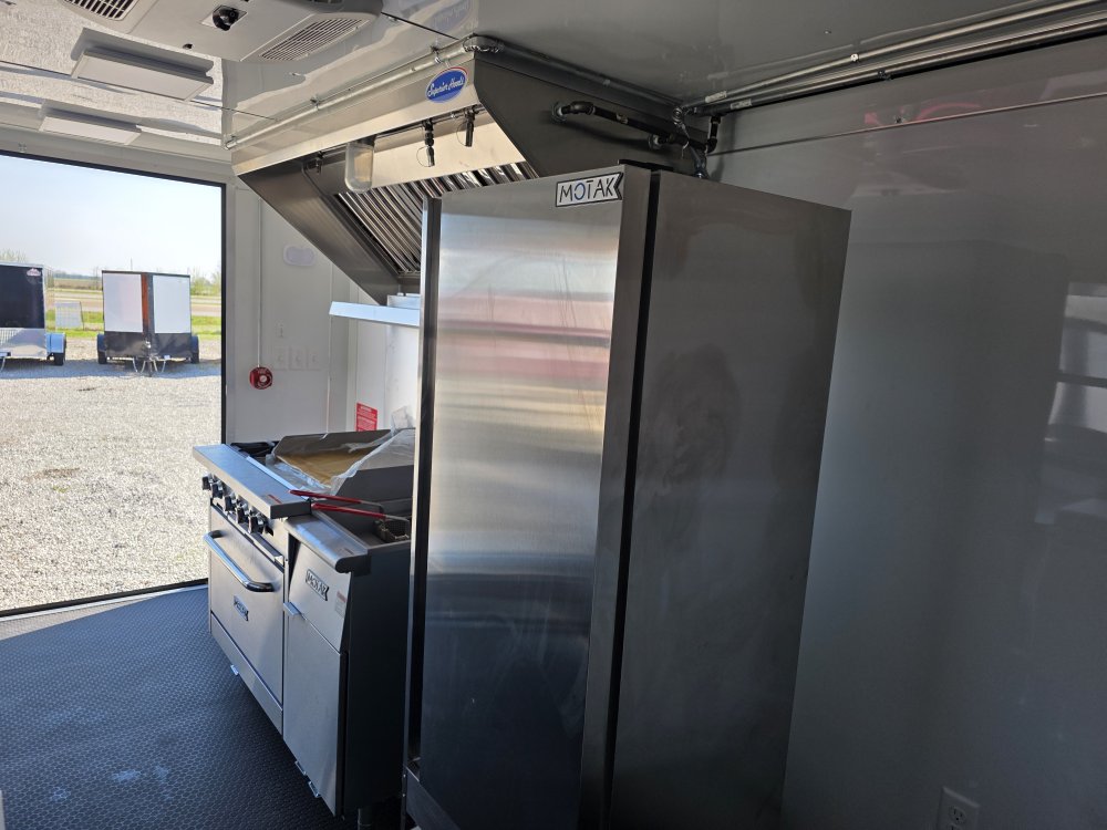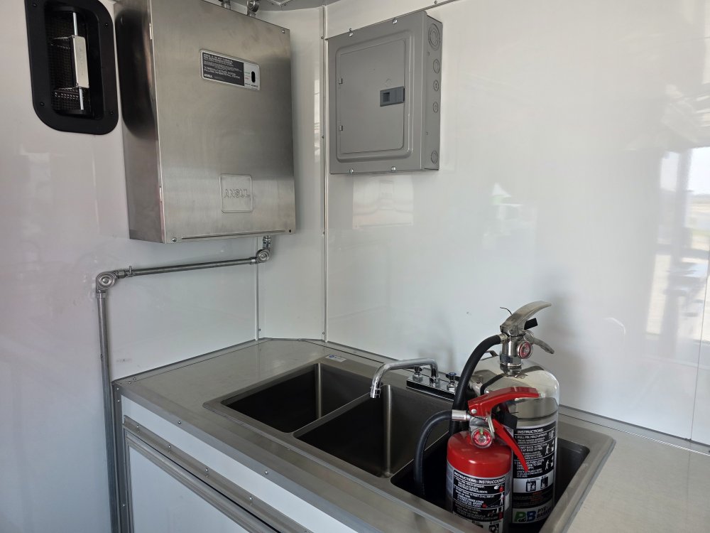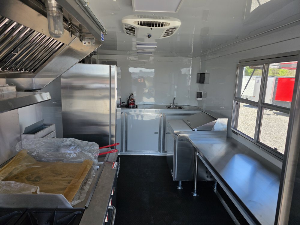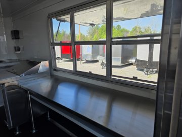 This Concession Trailer Package is designed for efficient roadside sales and service, featuring a practical layout for easy operation. Access is managed through a full-sized 36" x 78" rear side door for seamless entry and exit. The main serving area includes a 3' x 6' concession door positioned 36" above the finished floor and on the center of the passenger side, perfect for customer interaction. The included electrical package ensures you're ready to operate, providing power via a 60 AMP box with a 50 AMP motorbase and a 50 AMP twist-lock cord. Interior illumination is provided by two bright 2' Flat Panel LED 100-volt lights, controlled by a single switch, and complemented by two conveniently placed receptacles for your essential equipment.