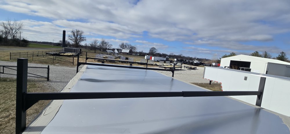 Features a striking Black Out Package, highlighted by all black trim and sleek black ATP fenders. It boasts a black stone guard and V-nose for a unified aesthetic, complemented by black ATP stepwells on 8.5' wide models. The look is completed with black barlocks, aluminum wheels with black inlay, and black aluminum side vents, creating a bold and cohesive appearance.