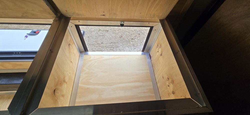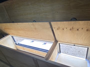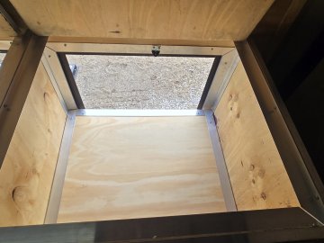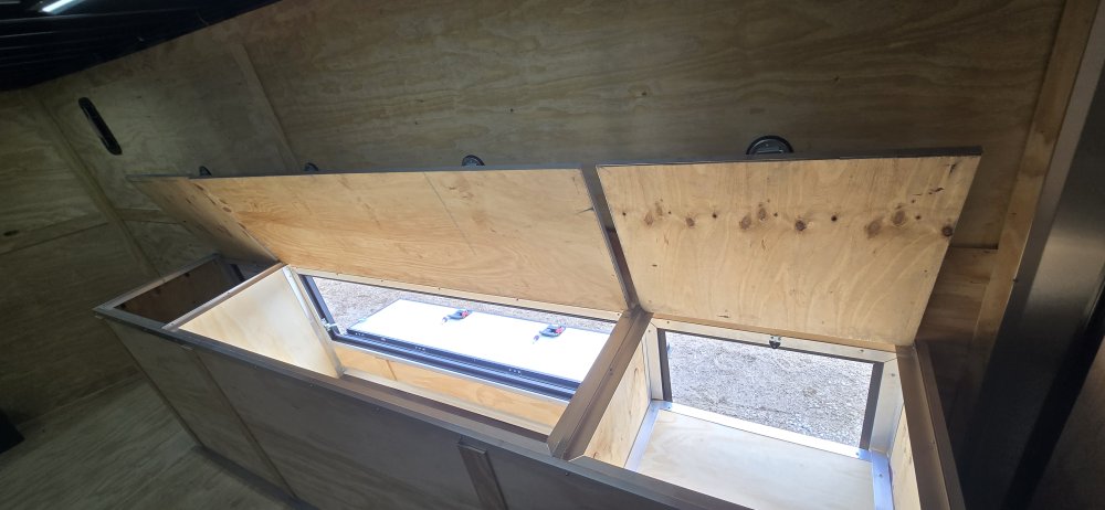 11' plywood cabinet (top open) w/ 2 shelves, 4 D-rings, and latches