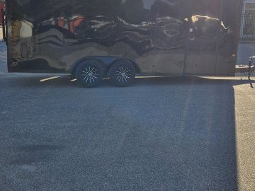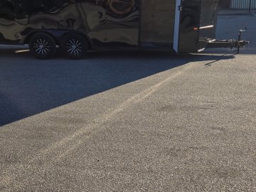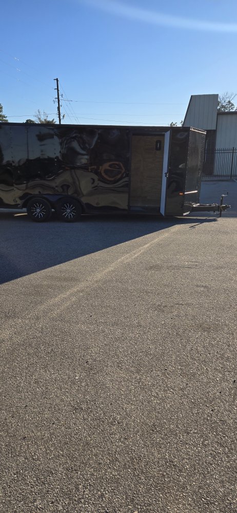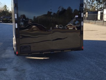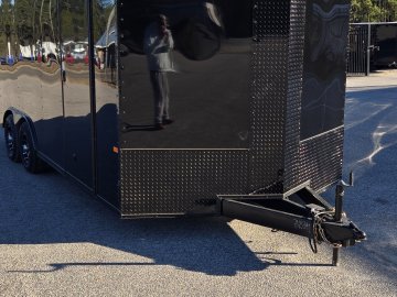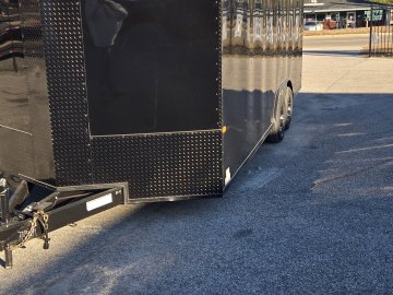 Features a striking Black Out Package, highlighted by all black trim and sleek black ATP fenders. It boasts a black stone guard and V-nose for a unified aesthetic, complemented by black ATP stepwells on 8.5' wide models. The look is completed with black barlocks, aluminum wheels with black inlay, and black aluminum side vents, creating a bold and cohesive appearance.