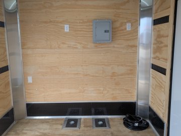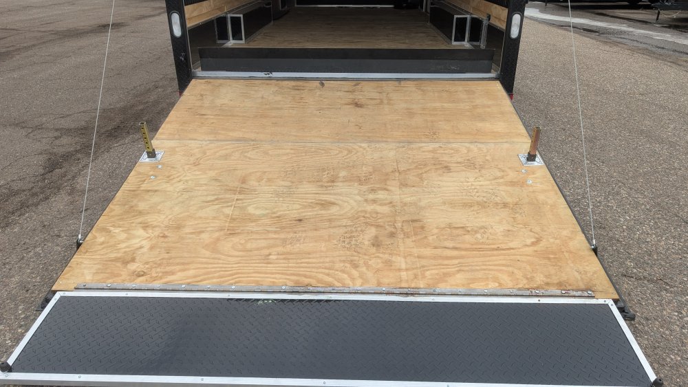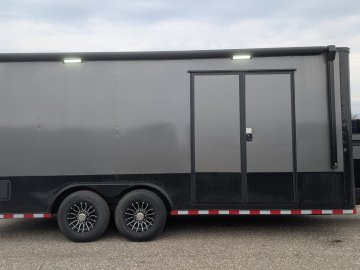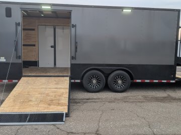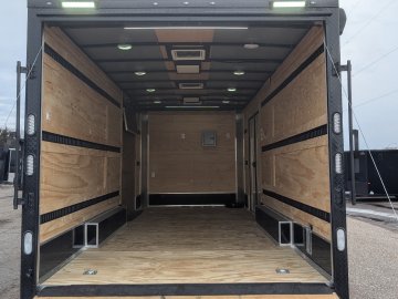 Designed for maximum utility and ease of access, this unit is equipped with a Super Duty ramp door featuring double spring assist, a 5' side ramp, and 60" x 78" Elixer double doors. Loading and securing cargo is effortless thanks to 90 total feet of E-track with steel backing, 10" bogey wheels for ground clearance, and a comprehensive 50-amp electrical package. Power needs are fully covered by an 18' electric awning with its own battery, recessed dual battery boxes, and a sophisticated lighting array including 48" interior slim lights and seven 13" exterior LED floodlights. From the black ATP covered tongue to the adjustable 2-5/16" coupler, every inch of this trailer is spec'd for heavy-duty performance and a premium aesthetic.