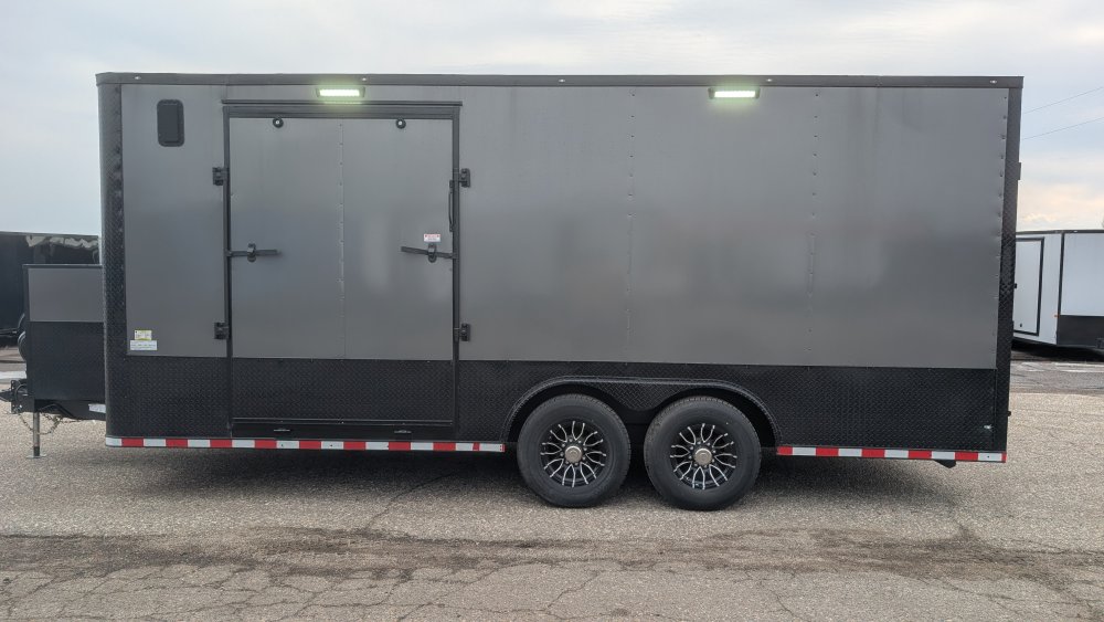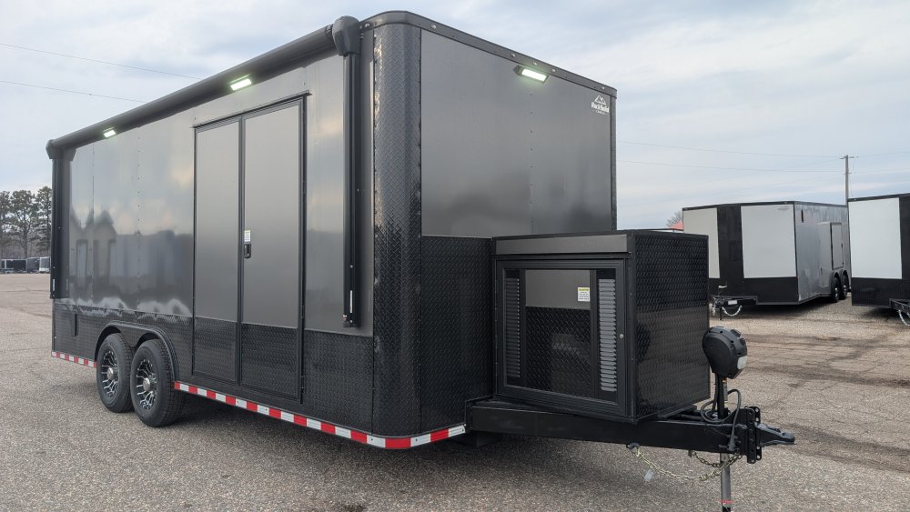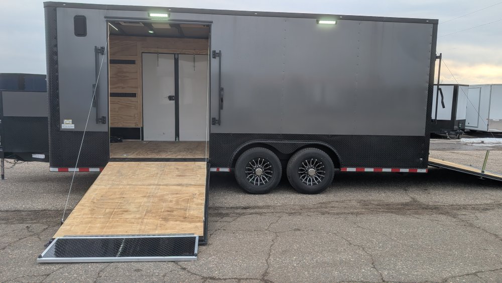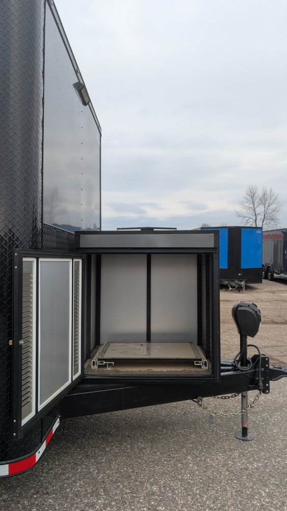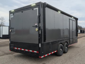 This professional-grade Charcoal Gray Polycore custom trailer is a powerhouse of durability and style, engineered for those who demand a "Rock Solid" build. Cloaked in a sleek .080 Polycore exterior with a full Black Out Package, it features black ATP accents across the sides, rear, fenders, and stoneguard, providing a sharp, aggressive look that holds up on the road. Structural integrity is at the forefront with 12" on-center cross members, heavy-gauge angle reinforcement on the top and bottom walls, and a massive 7,000 lb torsion axle system supported by a 60" extended triple tube tongue. The interior is equally rugged, boasting 12" additional height, 3/4" pressure-treated double plywood floors, and 3/4" plywood walls, all kept comfortable by a Therma Cool ceiling and a trio of Maxxair-covered vents.