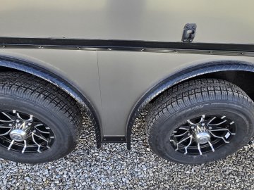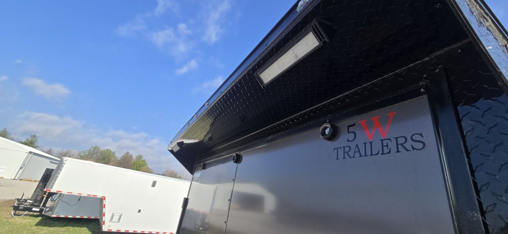 Features a striking Black Out Package, highlighted by all black trim and sleek black ATP fenders. It boasts a black stone guard and V-nose for a unified aesthetic, complemented by black ATP stepwells on 8.5' wide models. The look is completed with black barlocks, aluminum wheels with black inlay, and black aluminum side vents, creating a bold and cohesive appearance.