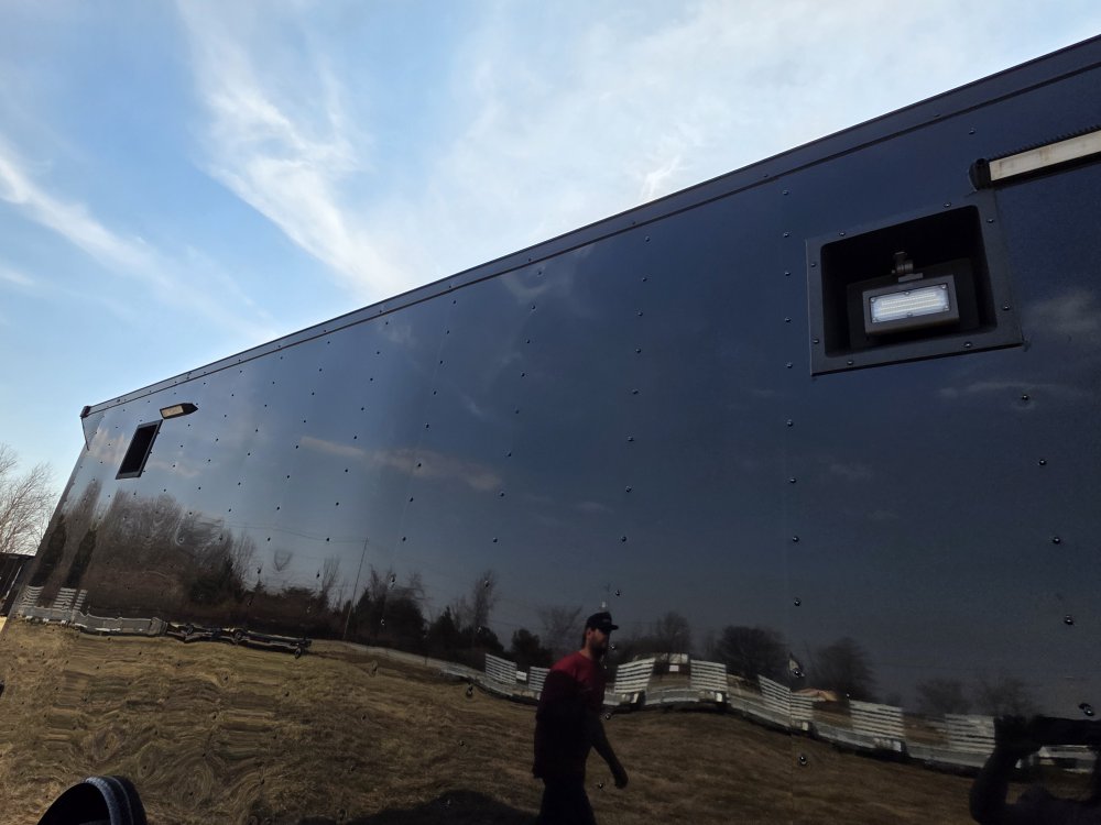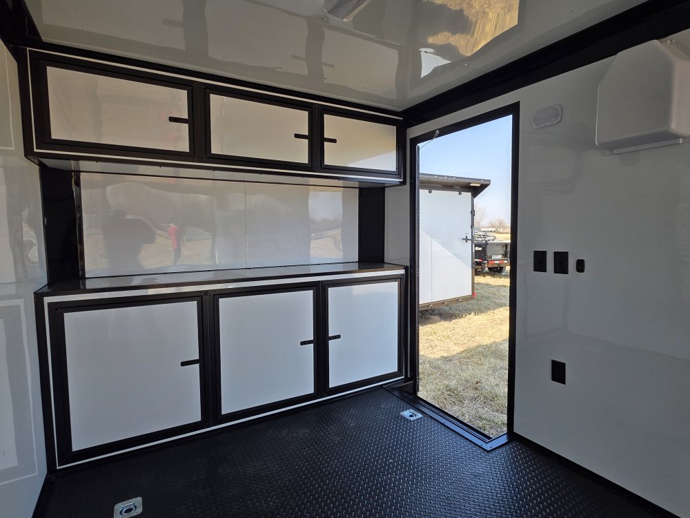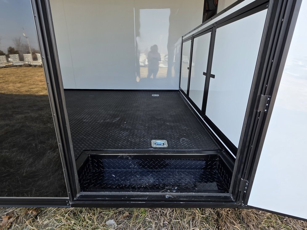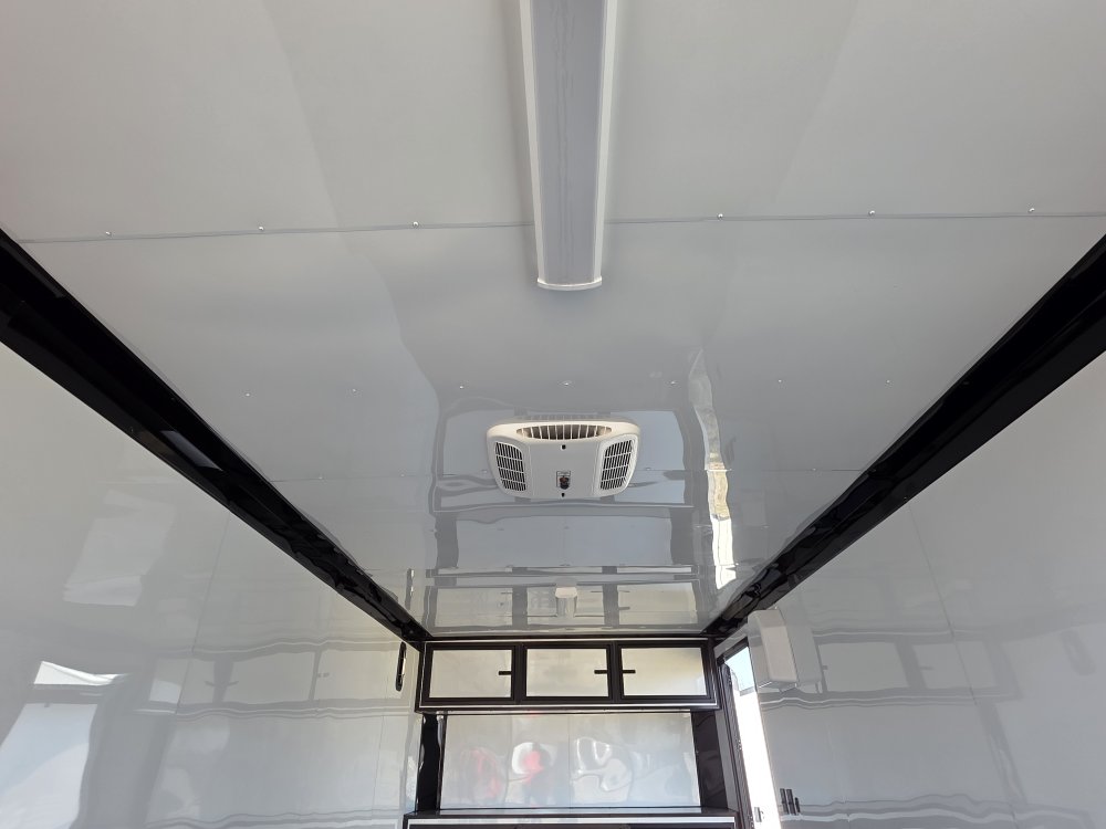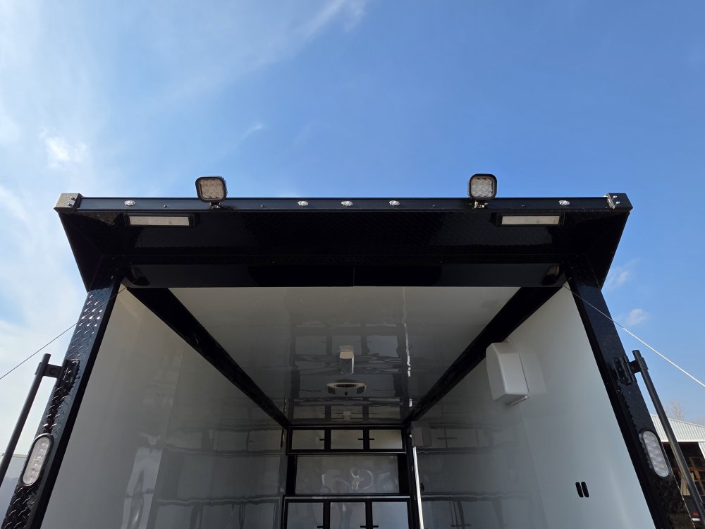 This trailer comes with an integrated Rear Spoiler with a Light Package, powered by a 12-volt battery with a dedicated box. The interior is brightly lit by four 48" 12-volt slim LED lights controlled by a wall switch. For exterior illumination, it features two 13" 12-volt LED flood lights on the spoiler and two additional 13" 12-volt LED flood lights on the passenger side.