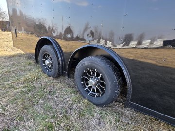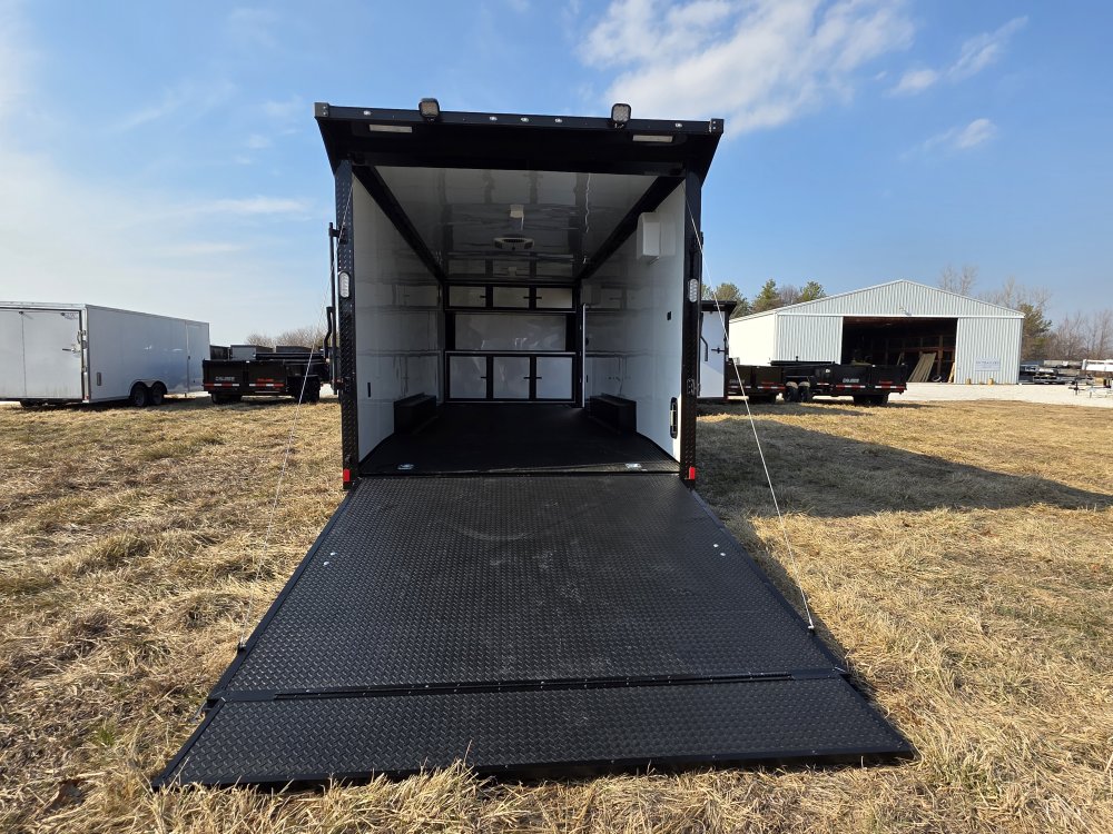 Features a striking Black Out Package, highlighted by all black trim and sleek black ATP fenders. It boasts a black stone guard and V-nose for a unified aesthetic, complemented by black ATP stepwells on 8.5' wide models. The look is completed with black barlocks, aluminum wheels with black inlay, and black aluminum side vents, creating a bold and cohesive appearance.