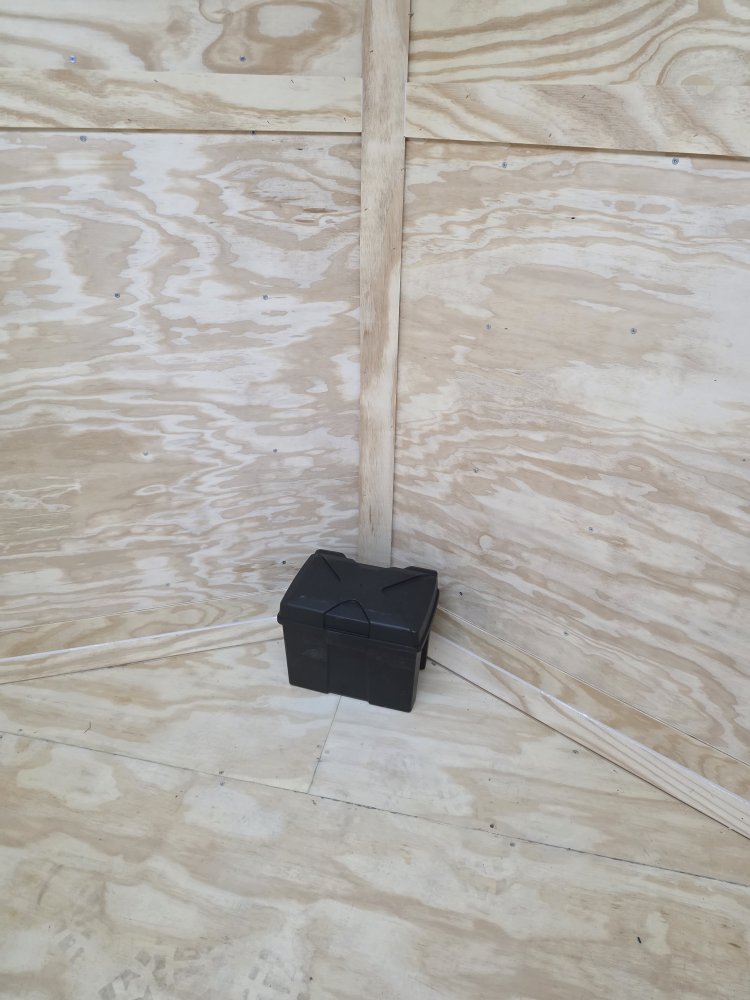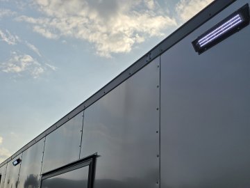This trailer comes with an integrated Rear Spoiler with a Light Package, powered by a 12-volt battery with a dedicated box. The interior is brightly lit by four 48" 12-volt slim LED lights controlled by a wall switch. For exterior illumination, it features two 13" 12-volt LED flood lights on the spoiler and two additional 13" 12-volt LED flood lights on the passenger side.