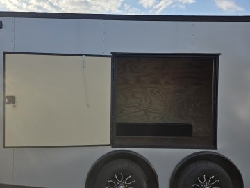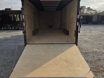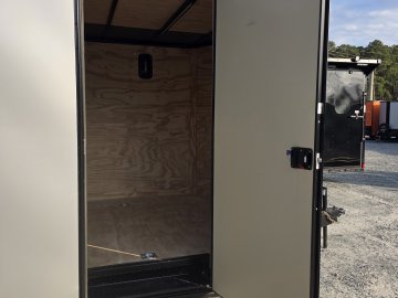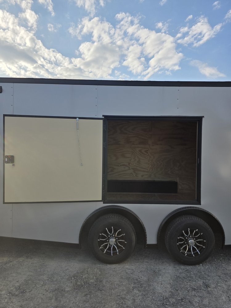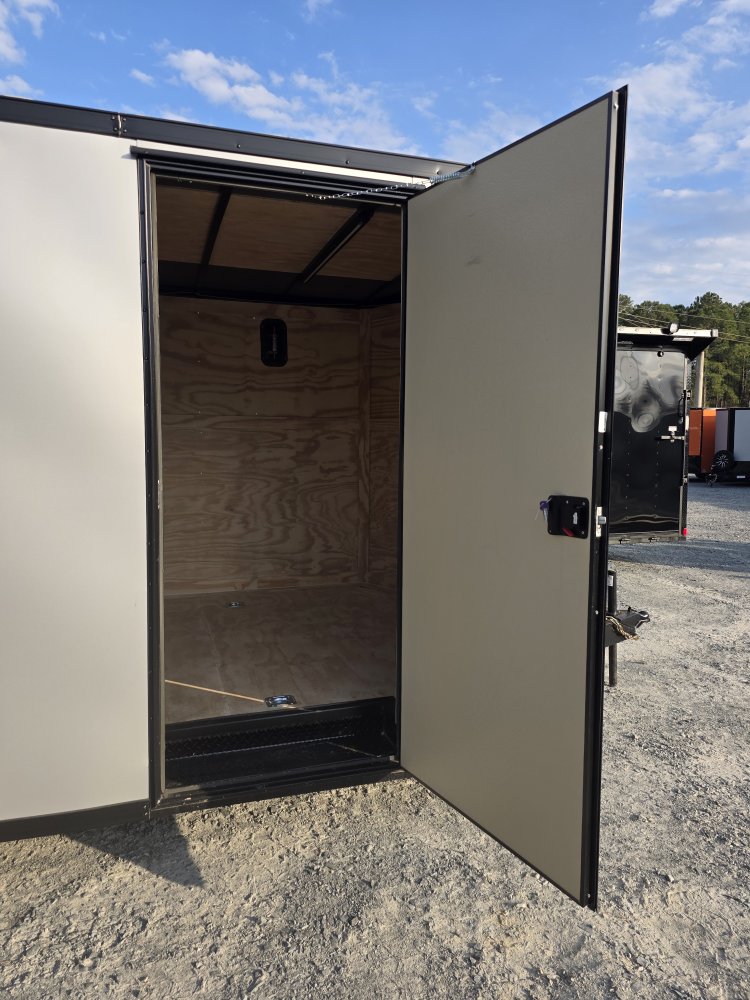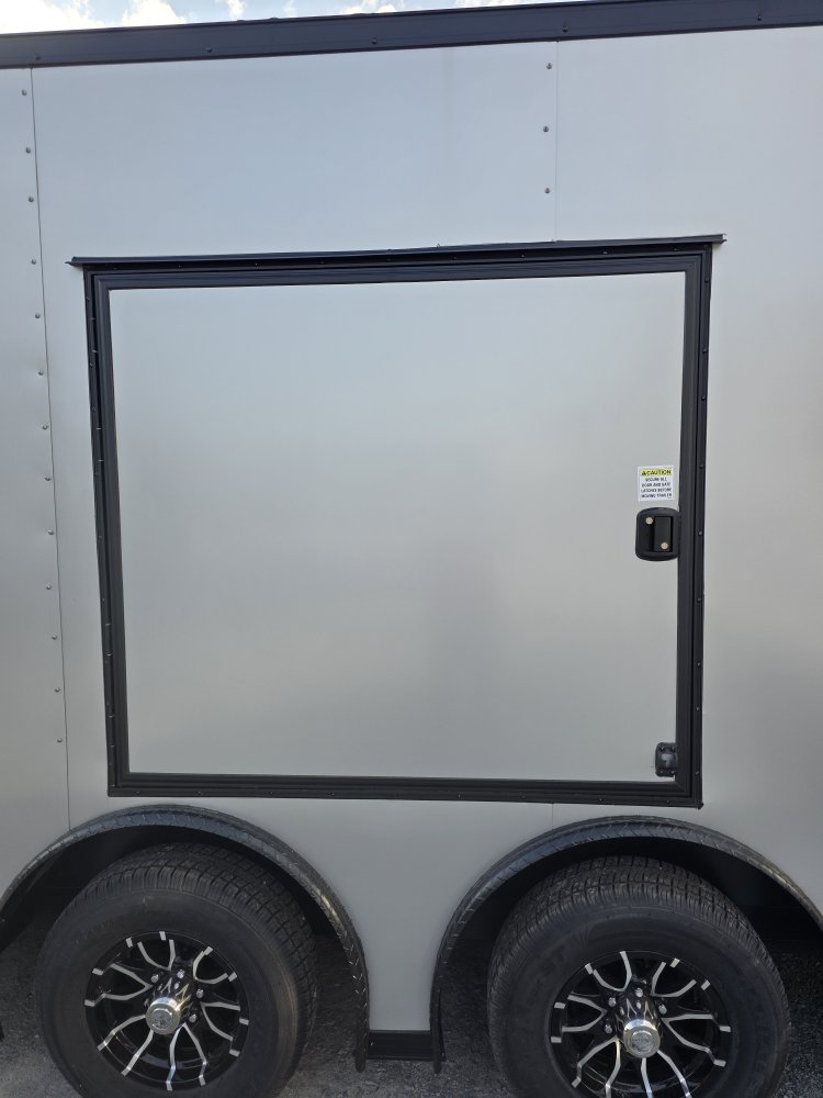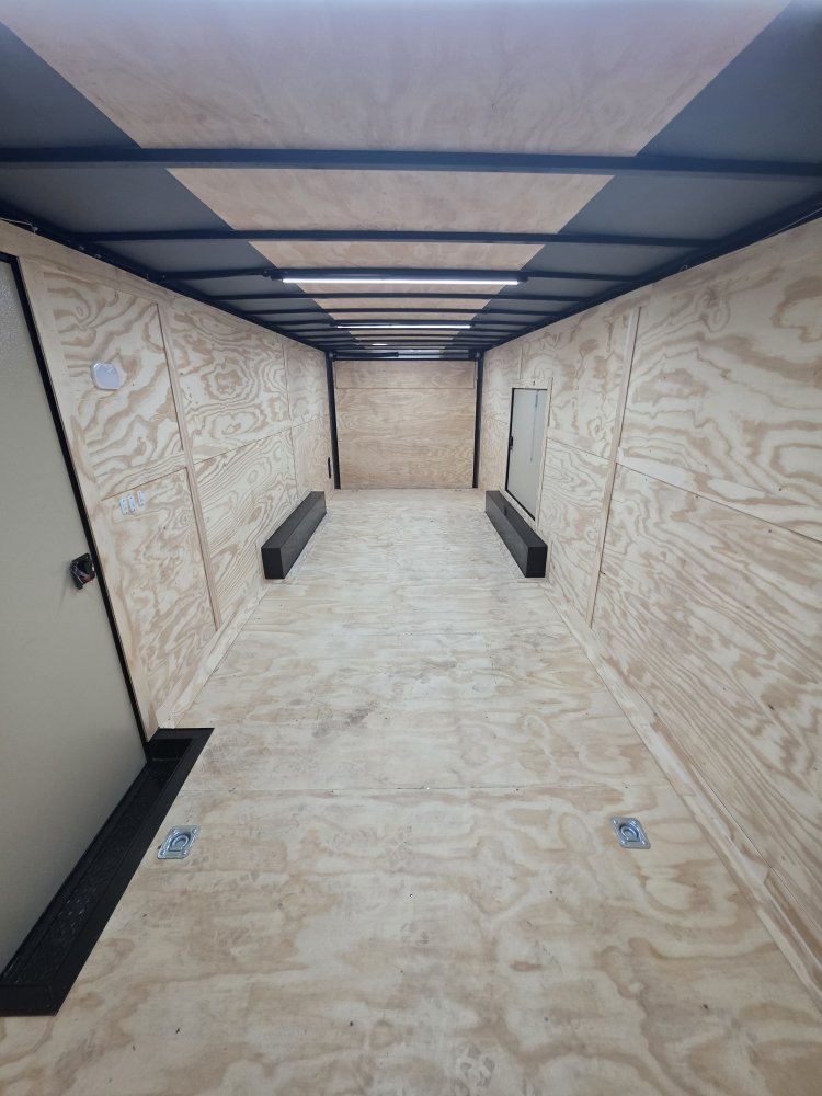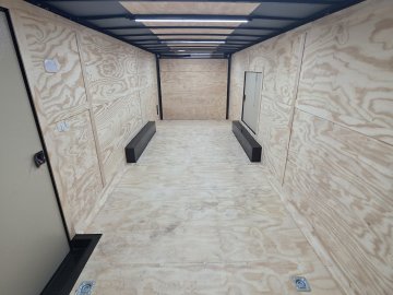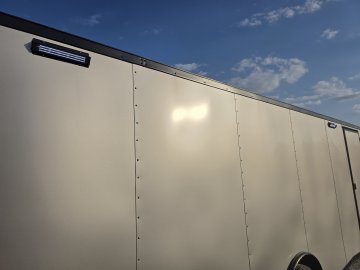 This heavy-duty enclosed trailer is built to last with a robust 6" steel tube main frame and 24" on-center spacing for the roof bows, and 16” on floor cross members, and sidewalls, ensuring superior structural integrity. It features a durable ¾" plywood floor and 3/8" plywood walls, plus a Therma Cool ceiling liner for climate management. Access is easy via a 36" side door with a flush lock and an ATP covered stepwell, illuminated by a 12-volt LED dome light. For secure transport, it includes electric brakes on both axles, a 7-way Bargman plug, and E-Z Lube hubs on its silver mod wheels. The V-nose design, 24" stone guard, and aluminum fenders add to its functionality and protection. Inside, you'll find 4 floor mount D-rings to secure your cargo, and a no-show beavertail for smooth loading. All lighting is LED for reliability.