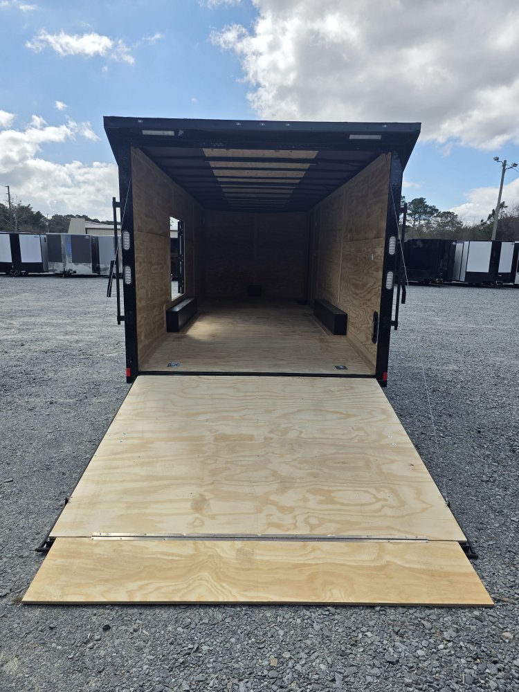 Features a striking Black Out Package, highlighted by all black trim and sleek black ATP fenders. It boasts a black stone guard and V-nose for a unified aesthetic, complemented by black ATP stepwells on 8.5' wide models. The look is completed with black barlocks, aluminum wheels with black inlay, and black aluminum side vents, creating a bold and cohesive appearance.